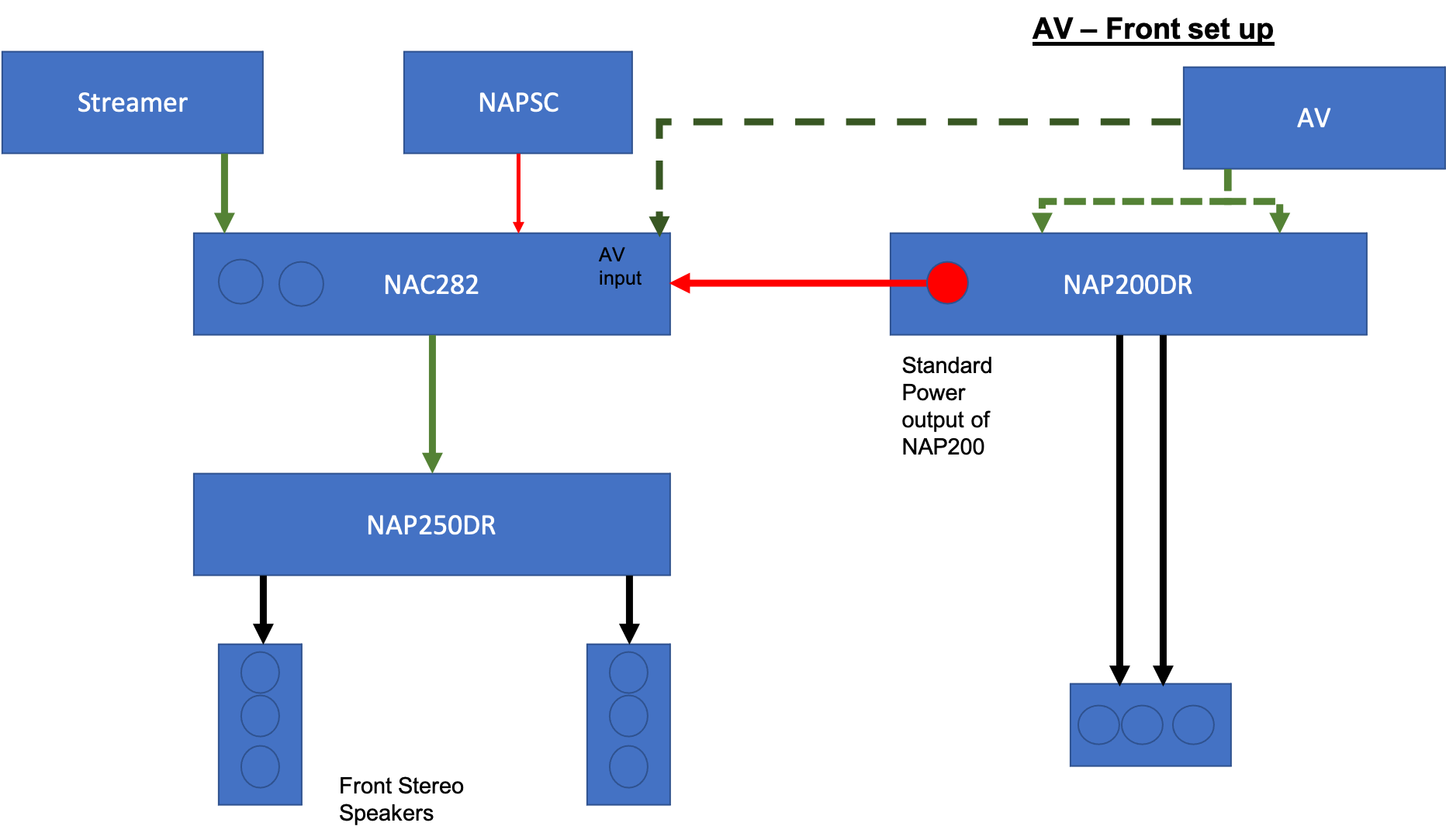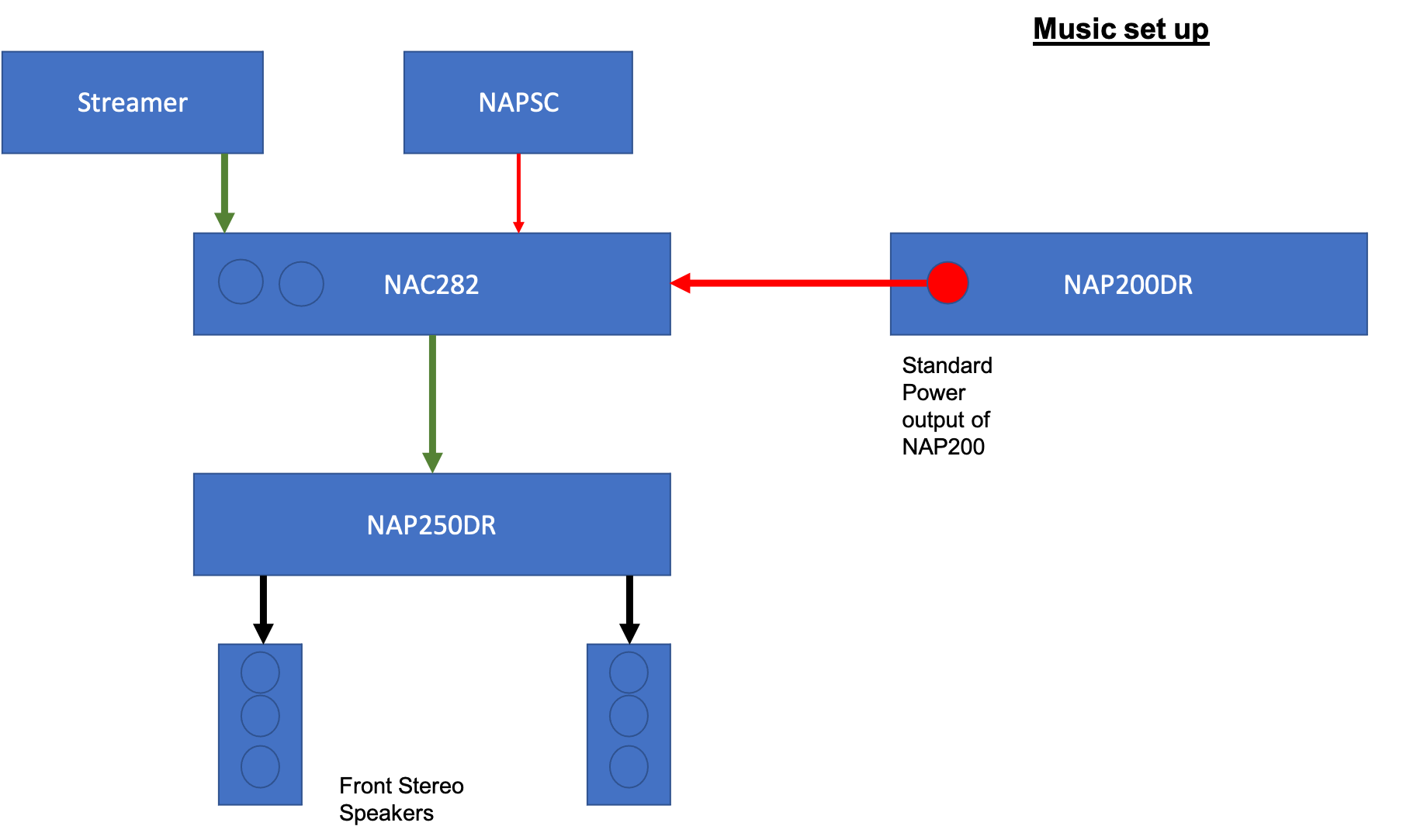 The music side will be the NAP250 and NAC282 (have seriously considered 272 as interim), using the AV input to take a feed from my AV processor. This uses standard cables (Chord Shawline from processor into preamp).