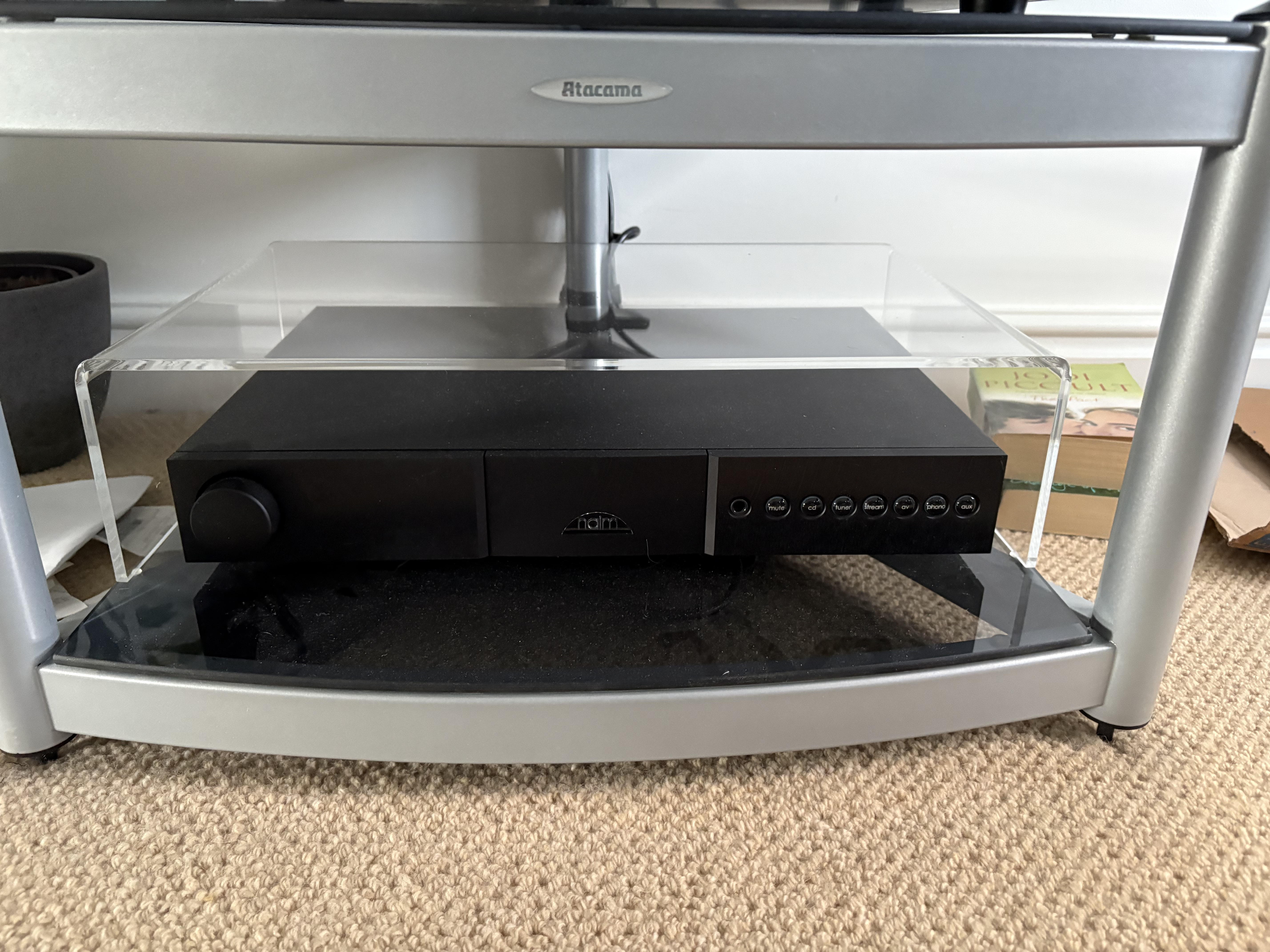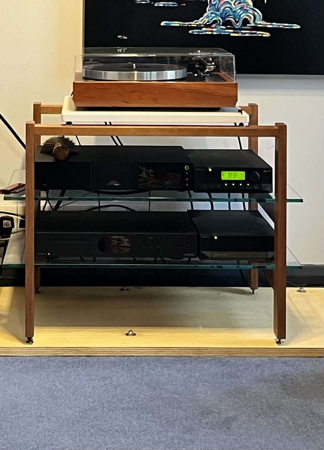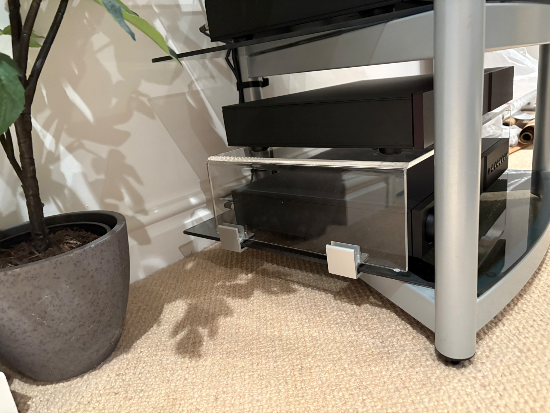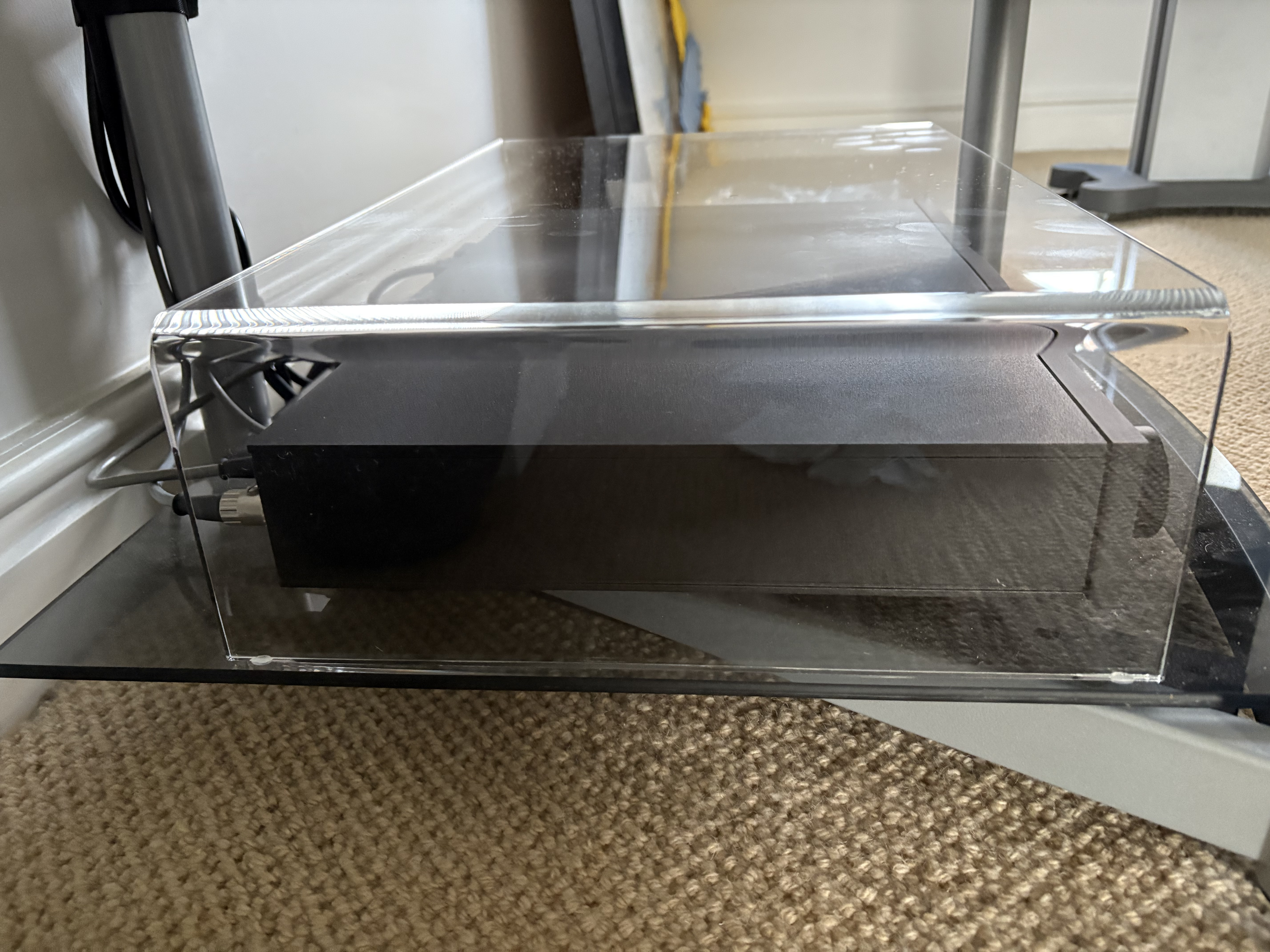 My issue is how do I add it? I came up with my DIY Mezzanine solution because the equinox rack has a lot of space between the “ground” and “first floors”. It is very stiff acrylic on small isolation pads and the Flatcap will sit on top.