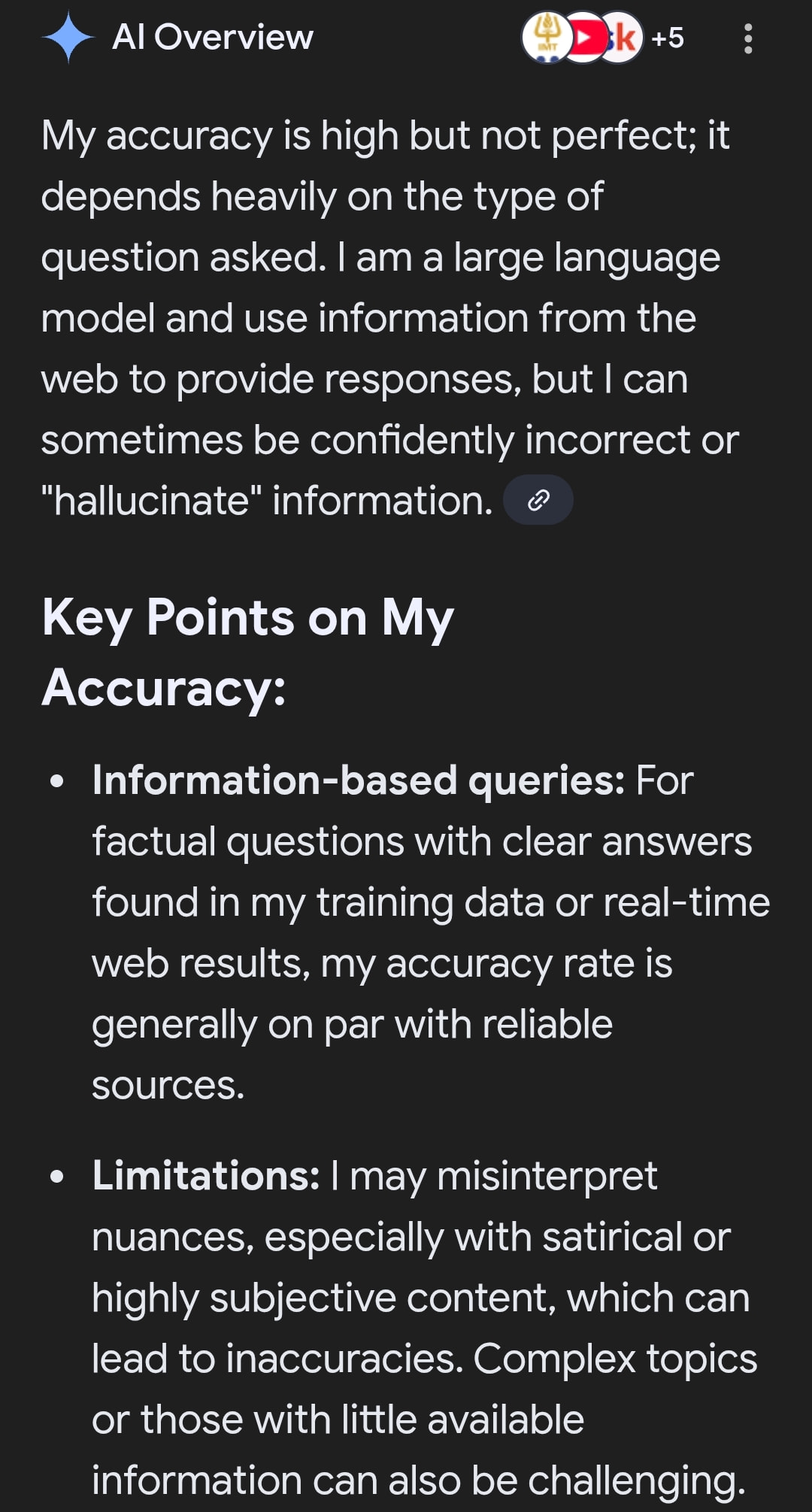Which? Consumer magazine recently did an accuracy study on AI answers and found the common AI service responses ranged from a very poor average 55% accurate to only an average pf 71% for the best.