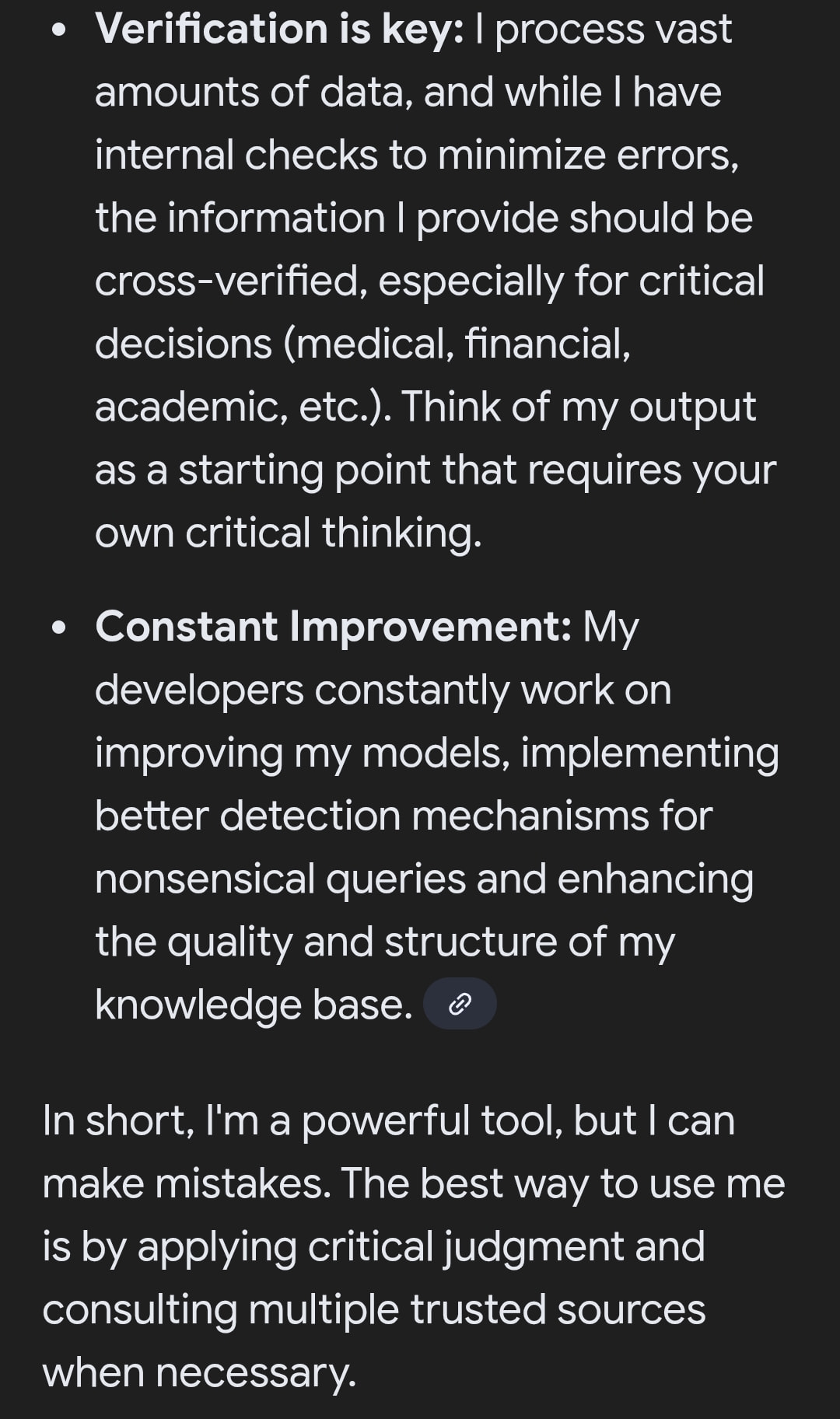 Not at all: My point is that there should be a clear warning on every AI site, because I guess that somewhere between 50 and 90% of people believe everything that AI tells them without any verification on their part. And I was picking up on LindsayM’s observation that people will need to be smarter in evaluation of what AI produces, and coupled that with my very low expectation that the majority be when using AI, unless something continually presses on them that AI is very far from perfect, certainly with the current generative AI tools widely available to the masses.