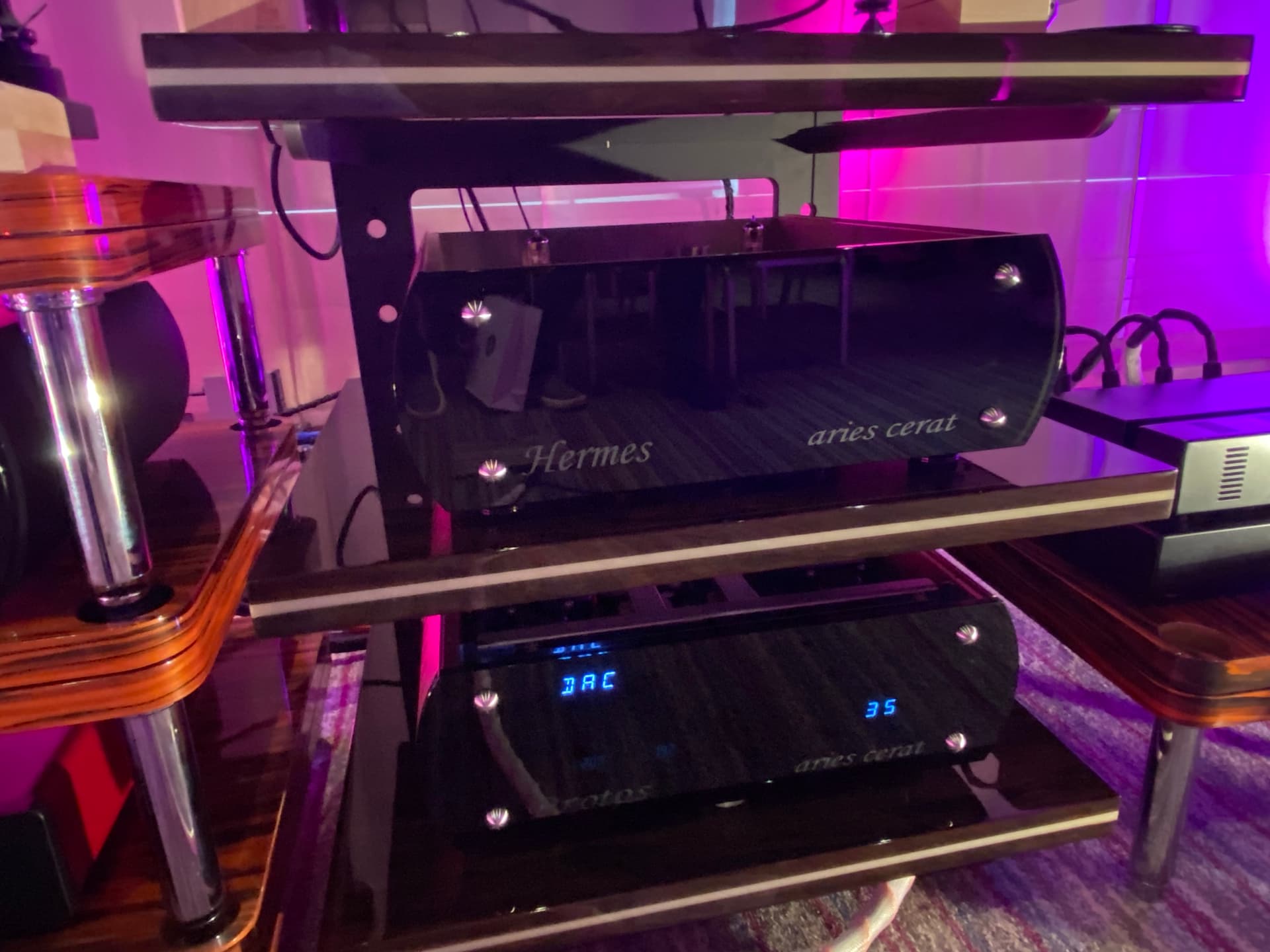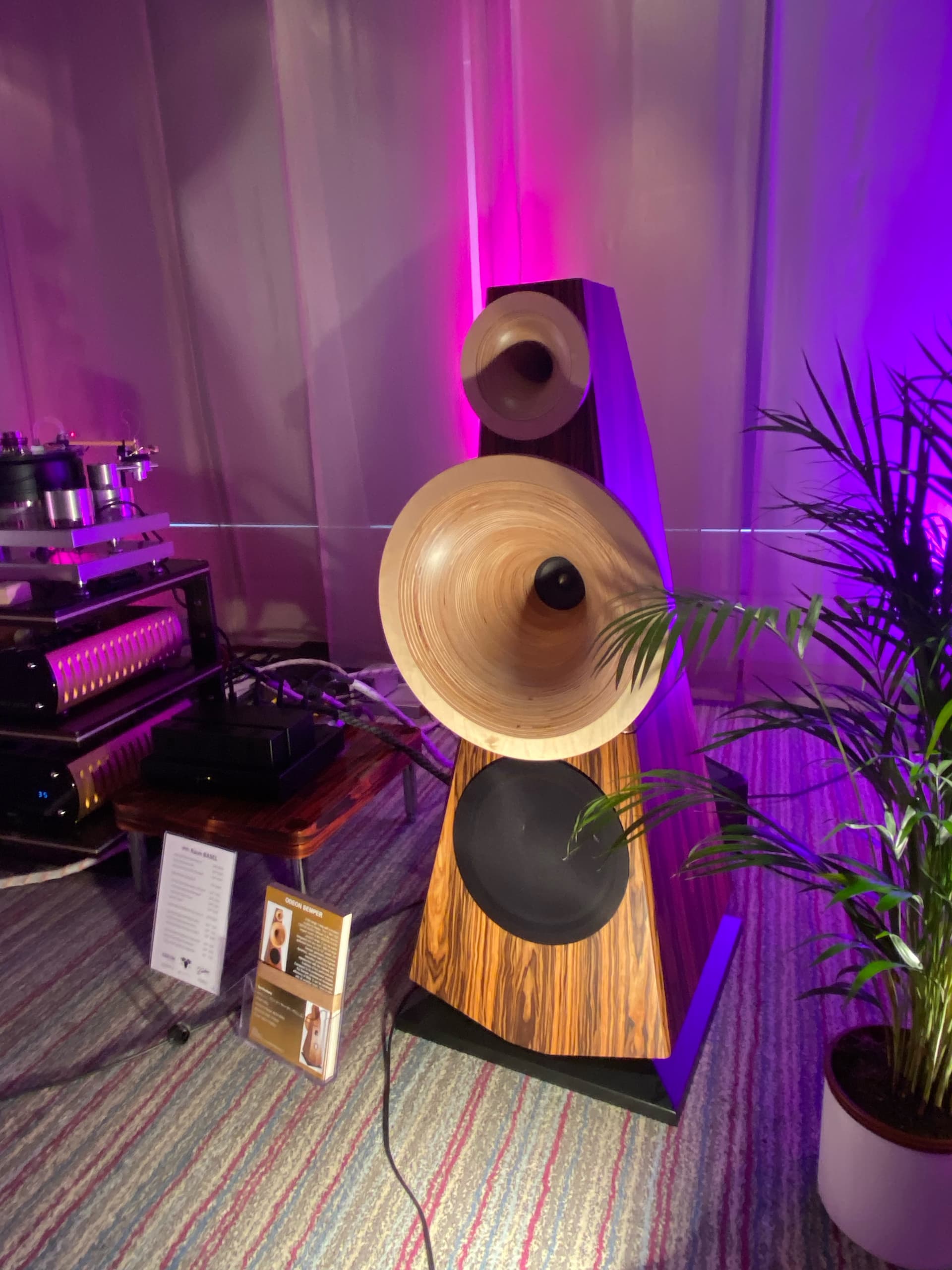 An absolutely convincing performance: a powerful, room-filling sound image, extremely dynamic vocal reproduction, natural reproduction of classical instruments (e.g. cello), precise spatiality bordering on oversized presentation. Everything sounded lively, present, rather ‘in your face’ but never annoying or shrill. Although these were ‘entry level’ devices from Aries Cerat (DAC Heléne, Hermes phono stage, Protos integrated amplifier), it was an atmospheric and emotionally stirring presentation. With component prices ranging from £13k to £23k, it was by no means the most expensive system at the show. However, the Odeon Semper loudspeakers were expensive (£42k). Horn loudspeakers also remain a matter of taste. For me, they are almost too much. A comparison with classic loudspeakers would have been interesting (they need a decent efficiency rating. The Protos is a 20-watt tube amplifier).