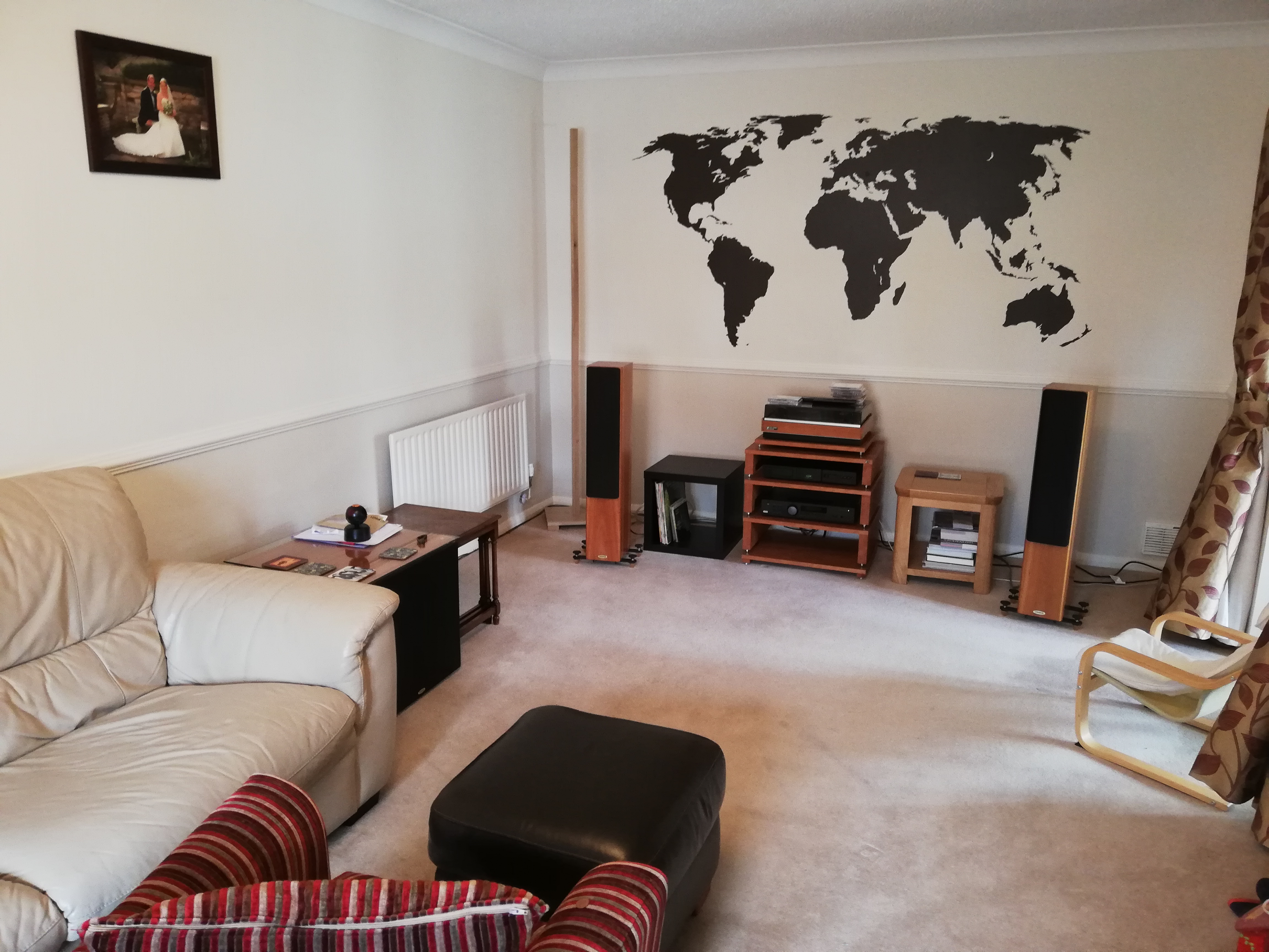 Our lounge (home of the main rig) is 3.5m wide by 6.5m long by 2.3m high, quite regular in shape and consists of plasterboard type construction with a carpeted floor and curtains. The main speakers are along one of the short walls firing down the length of the room. Over a period of time I think I have finally gotten the speakers (Tannoy R2s - 44 - 20khz) placed correctly. The sub (Tannoy R-sub 15) is located about 2m down the left hand long wall - much better than between the two stereo speakers.