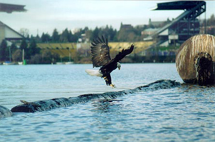 This picture of a bald eagle was taken while kayaking on Lake Washington with an older Minolta film camera in 1997. As I approached slowly the bird rose up and resettled on the log. I disturbed his lunch, that is a fish in his left talon with the University of Washington sports stadium and campus in the background.