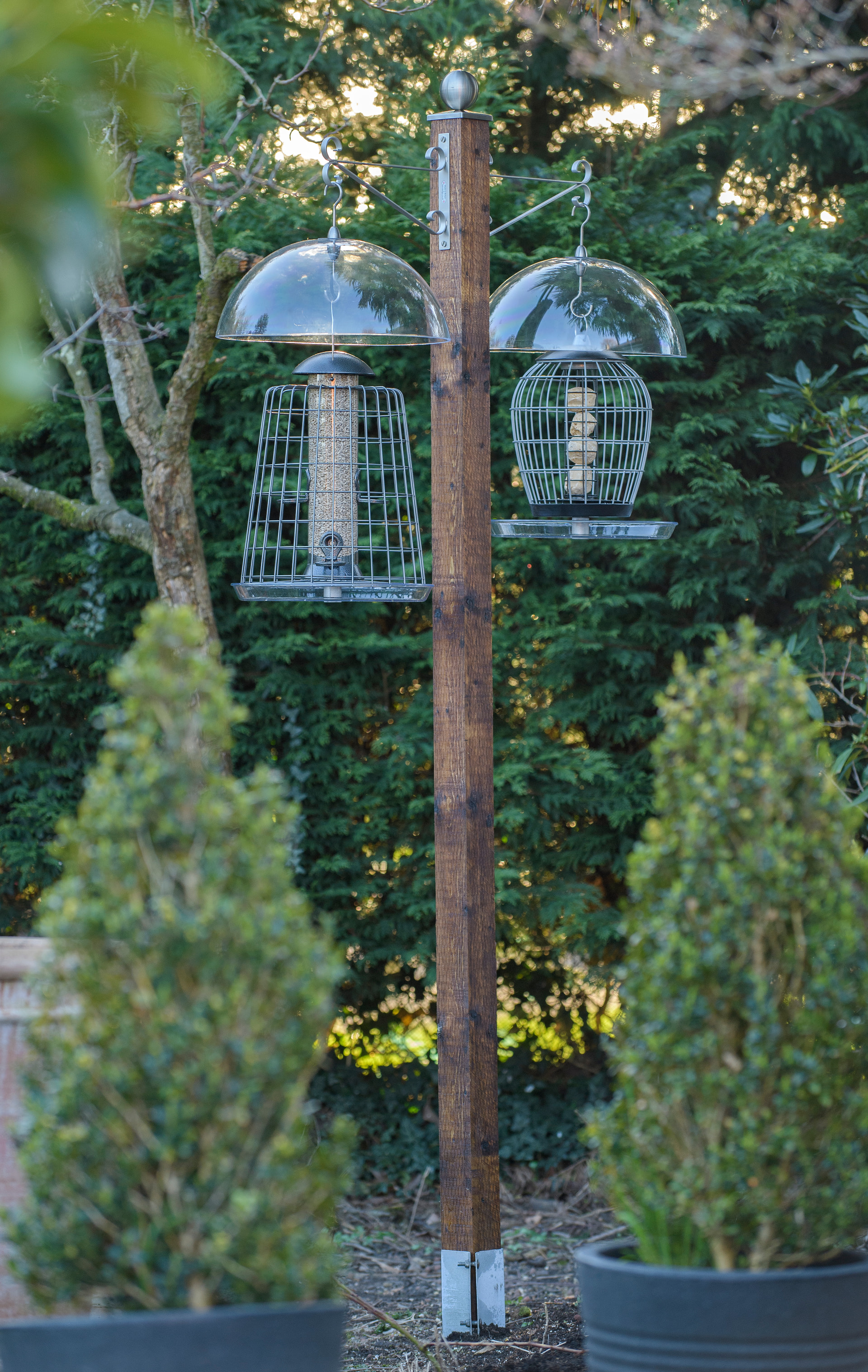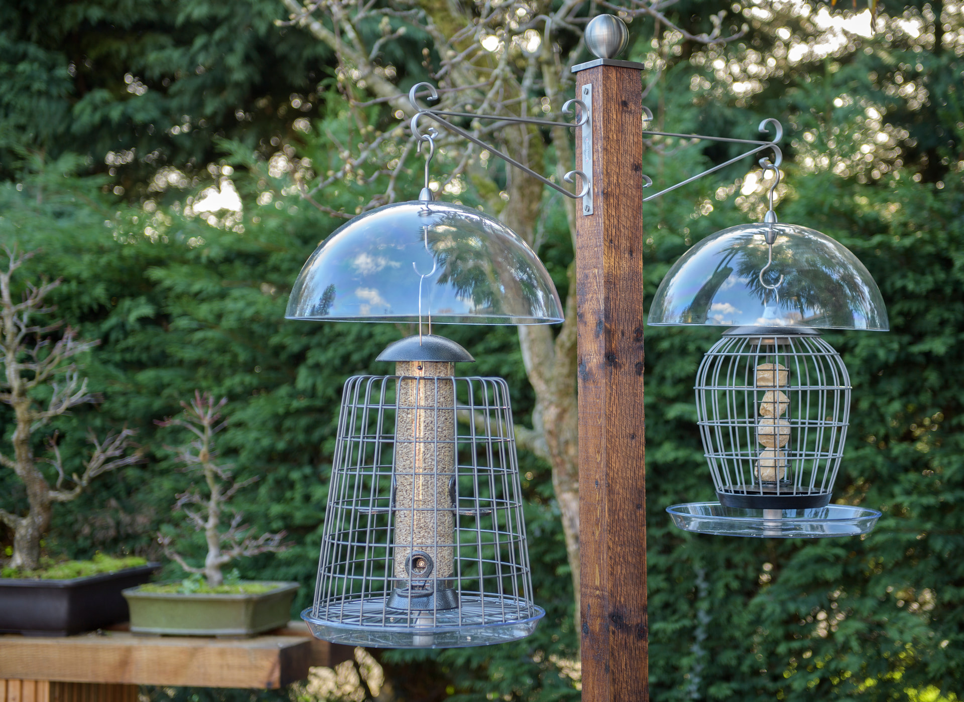 Two individual feeders with the cage a good distance away. The domes will keep a lot of the rain off.