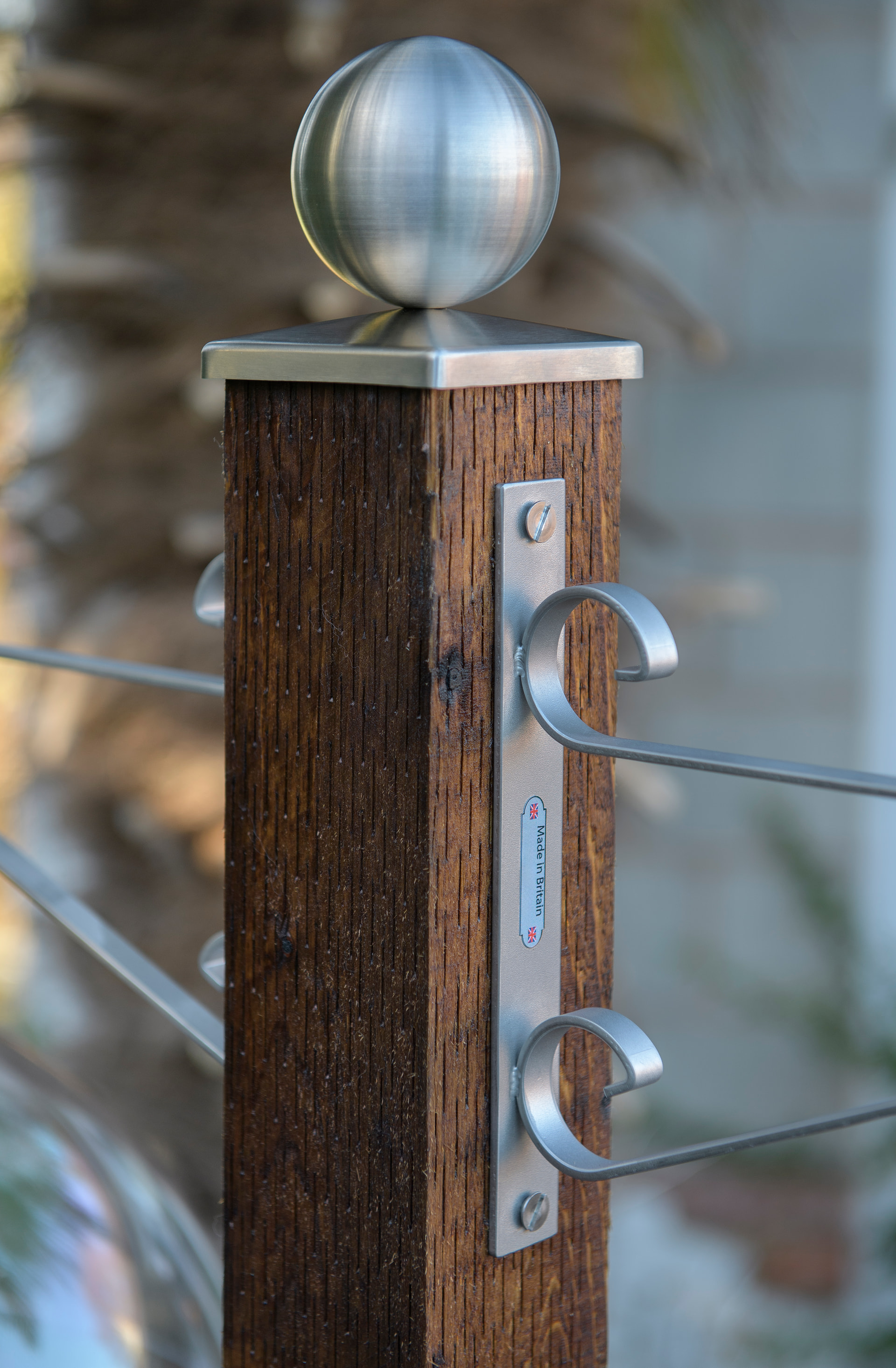 The brackets are 316 stainless steel. To top the pole off, I bought a cap and then sourced a ball to give a professional finish. Both in brushed stainless. I had to drill a hole in the centre of the cap (which was a pain) and mount the ball using a stainless screw, into the wood.