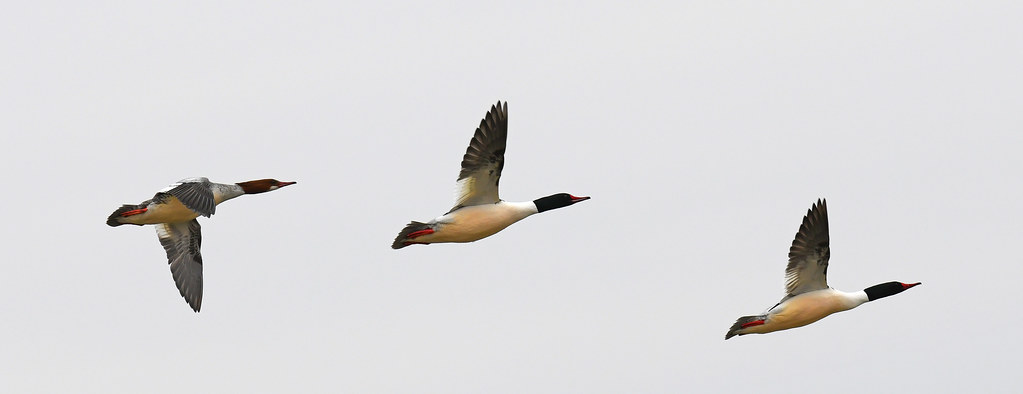A female Common Merganser is following her two male counterparts. They have shown up three days ago, still quite touchy, keeping humans at a safe distance. Nothing like a grey overcast day to accentuate their delicate tones.