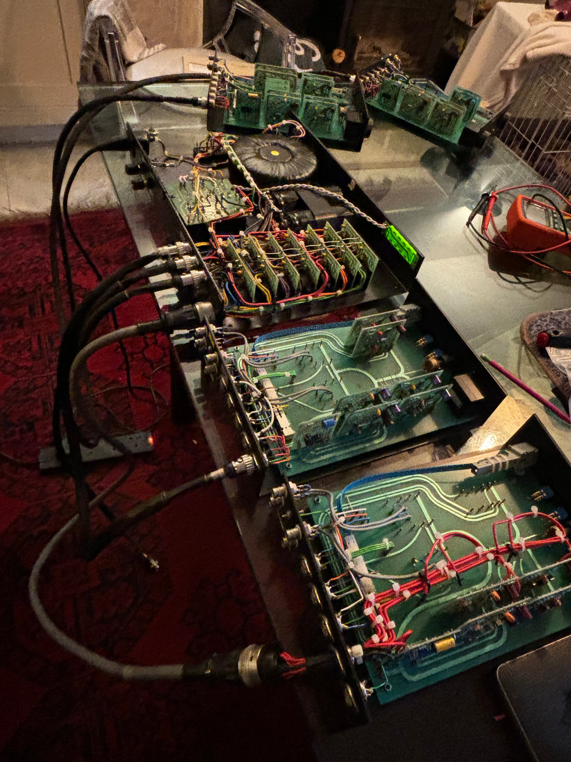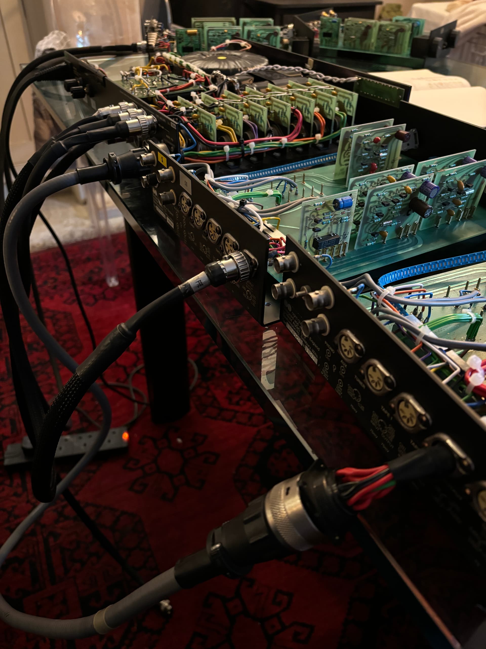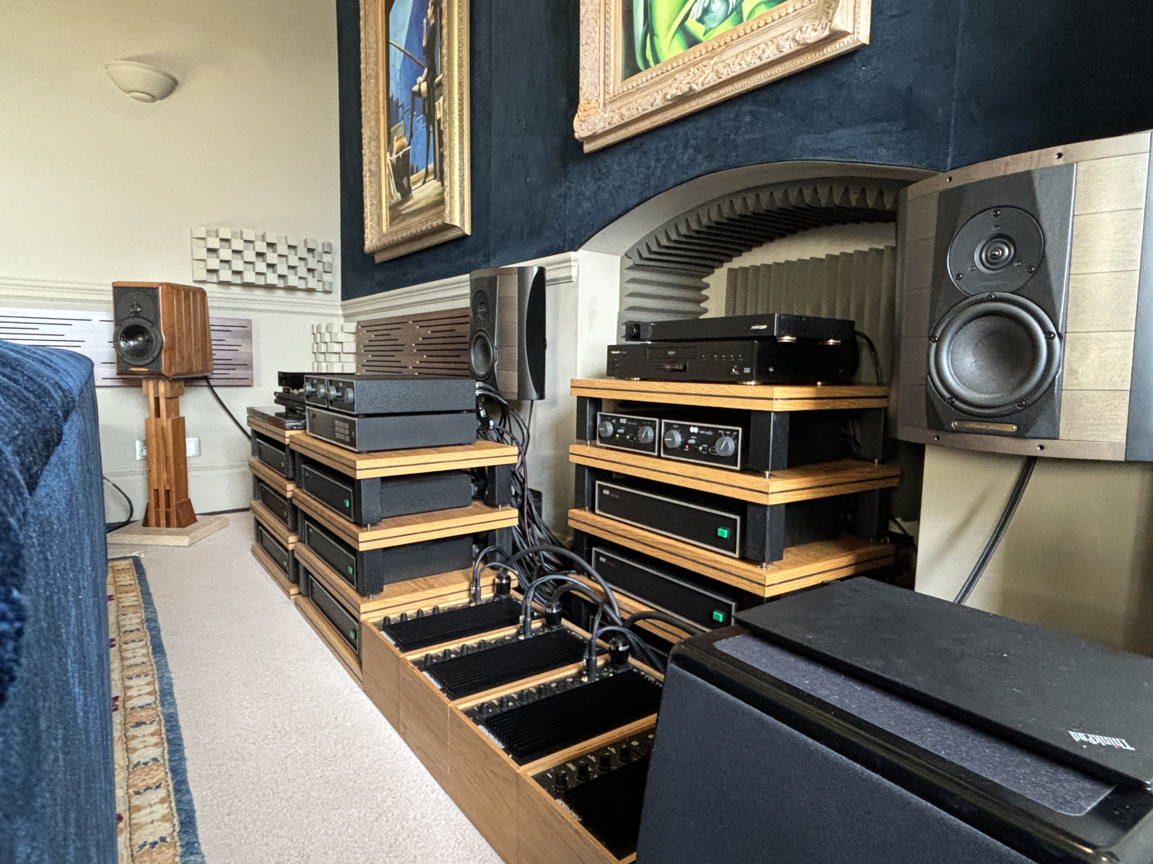 I run analogue out from the 9000 Blu-Ray for audio (Quite heavily modded) and HDMI for picture (Lumagen then projector) A supercap has been used to feed power to the 4 32.5’s I trim volume in the player so each wheel is matched and then have 4 volumes for 8 channels. Bass is more complex as I run 5 subs and only EQ and align those subs, no EQ on the 7 bed later channels