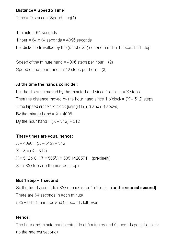 However, and this is where I think you made your mistake, you then used a calculator to divide 585 by 64 to find the number of minutes in 585 seconds. The answer is, of course, 9.140625 minutes - note my emphasis on minutes. So the time at which the hands coincide is 9 minutes past One o’clock and a further 0.140625 minutes. I think that you might have mistaken that 9.140625 as the number of seconds beyond the 9 minutes.