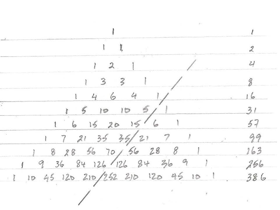 Then a bit more “day-dreaming” and I noticed that I could draw a straight “diagonal” line through Pascal’s Triangle so as to discard the unwanted numbers.