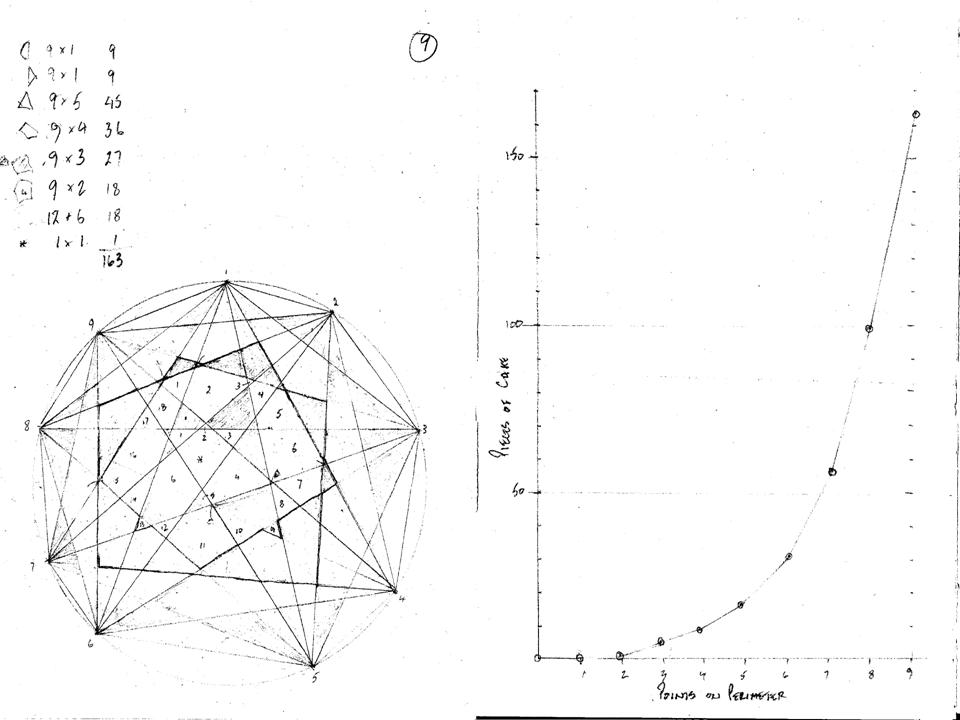Points are marked on the edge of a circular cake and straight lines are cut between each and every edge point, creating an increasing number of cake pieces. The diagram shows how the cake might look after the first few points: