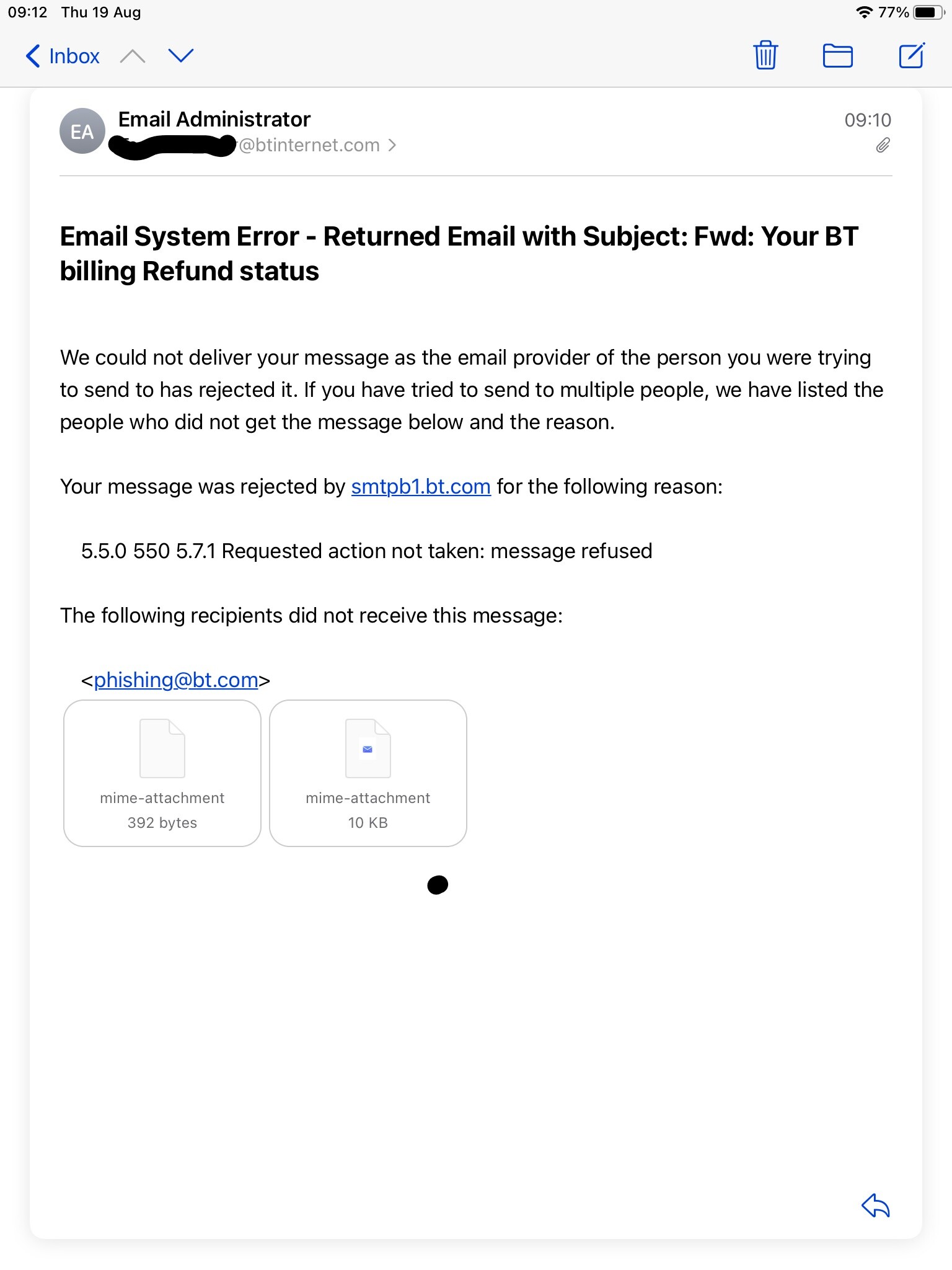It was purporting to be a BT mail, so as requested by BT, I initially attempted to forward to BT.