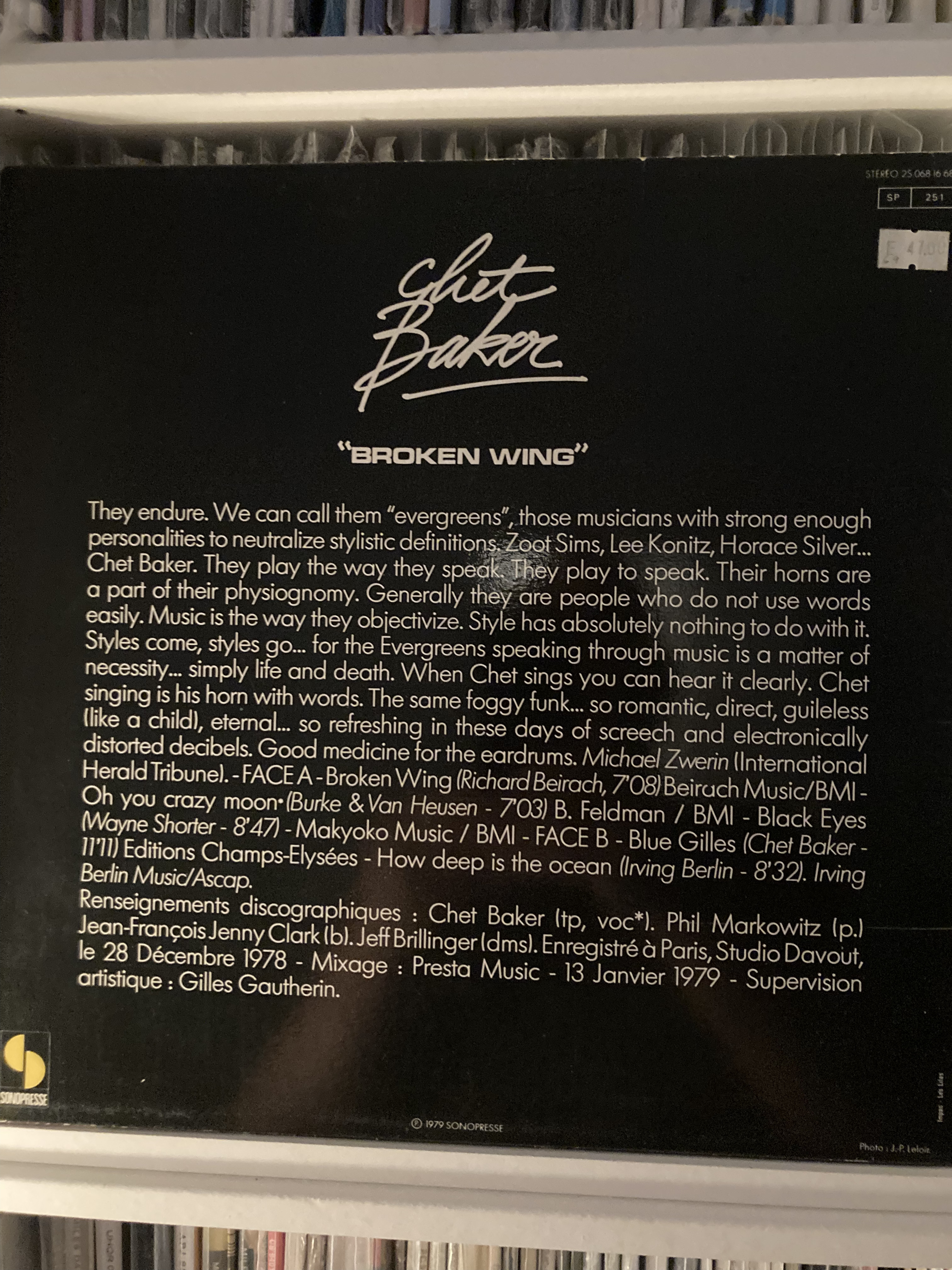 On December 28th 1978 Chet went into the Studio Davout, Paris to record Broken Wing with the excellent pianist Phil Markowitz, the title track had been written for Chet by his old band mate/student pianist Richard Beirach back in New York.