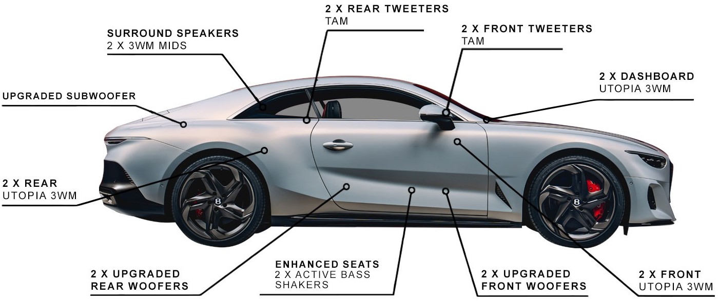 Its incomparable design is complemented by twenty high-performance speakers powered by 2,200 watts of power. These units are carefully placed throughout the passenger compartment. Note that additional reinforcement has been added around the doors and rear of the car to reduce speaker distortion.