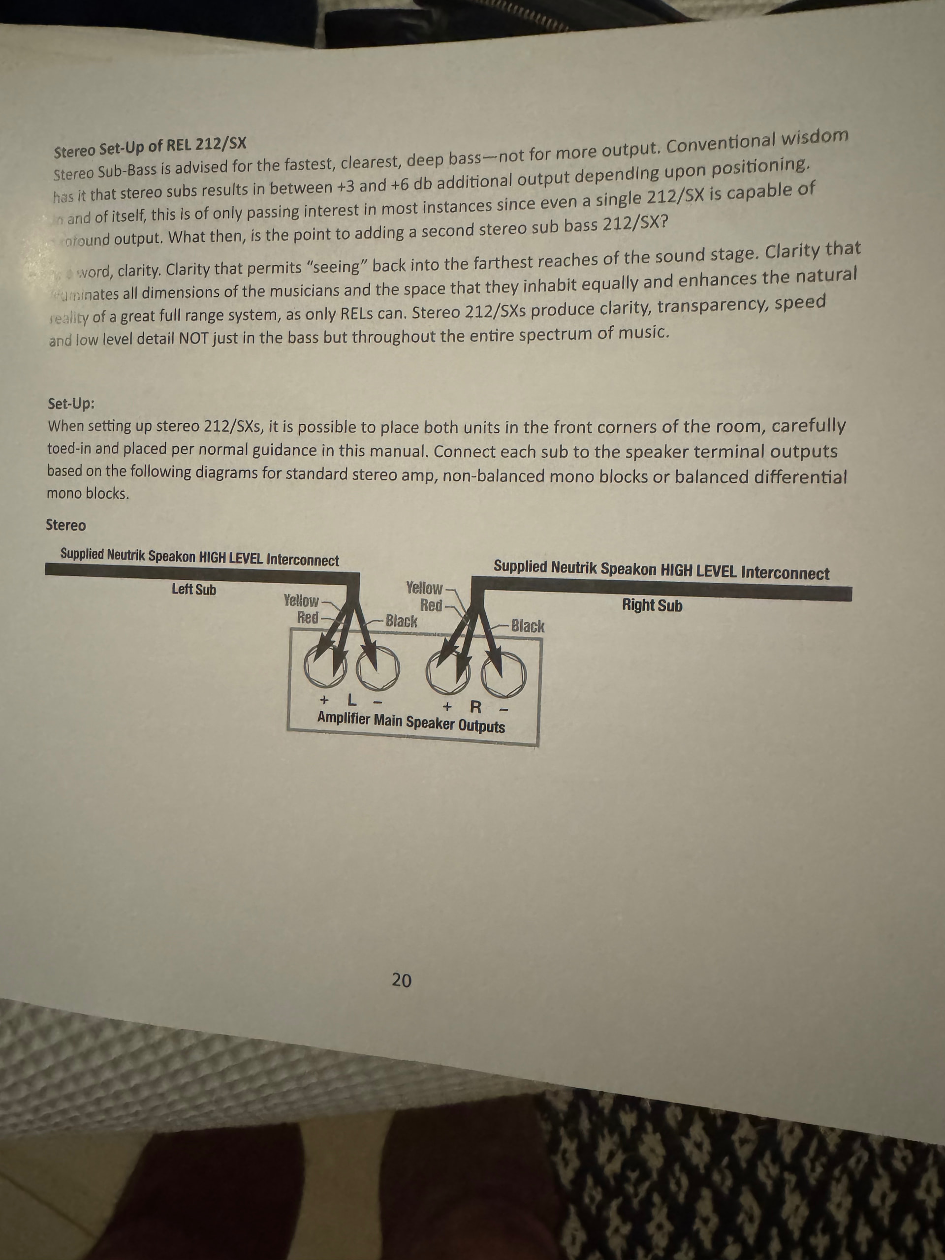 Good morning HungryHalibut. Attached is the relevant section from REL manual for setting up a pair of S212s. They indicate Yellow/Red are combined rather than split between +/- (as is the case for a single subwoofer). I have tried splitting the yellow/red this morning but it doesn’t sound better - I am playing at low volume as it is still ahead of the first cup of tea for the boss