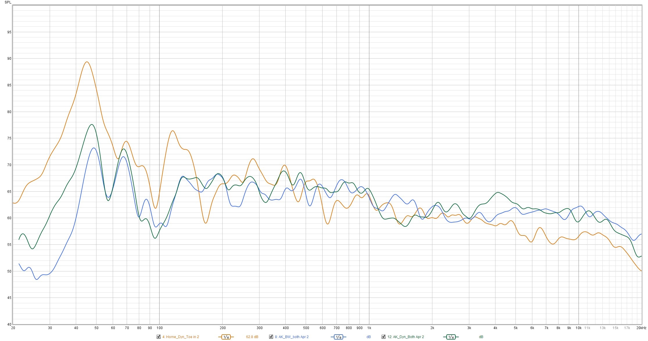 Being an engineer, of course I should follow a methodical approach to get to the root of the problem. So over to my friend go the Dynaudios. Time for some measurements first. In terms of frequency response, here are the Dynaudios (toed in) at my place (orange line), the Dynaudios (Green) and the B&W (blue) at my friend (no toe-in there). The curves have been SPL aligned by REW at 500Hz, 4-octave span. You can see how bad my room acoustics are! B&Ws also seem flatter overall. Their lower LF output is actually a blessing as it doesn’t excite the 47Hz room mode that much. They are also front ported which seems to make the in-room placement easier. I didn’t spend any time to optimise the Dynaudio position, which seem to be more picky for extracting the most out of them.