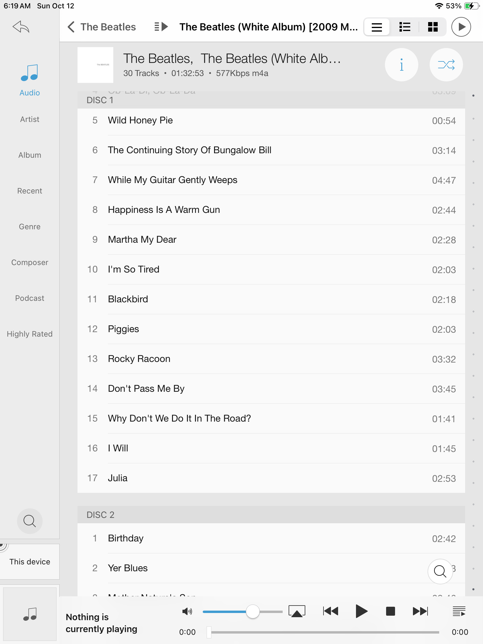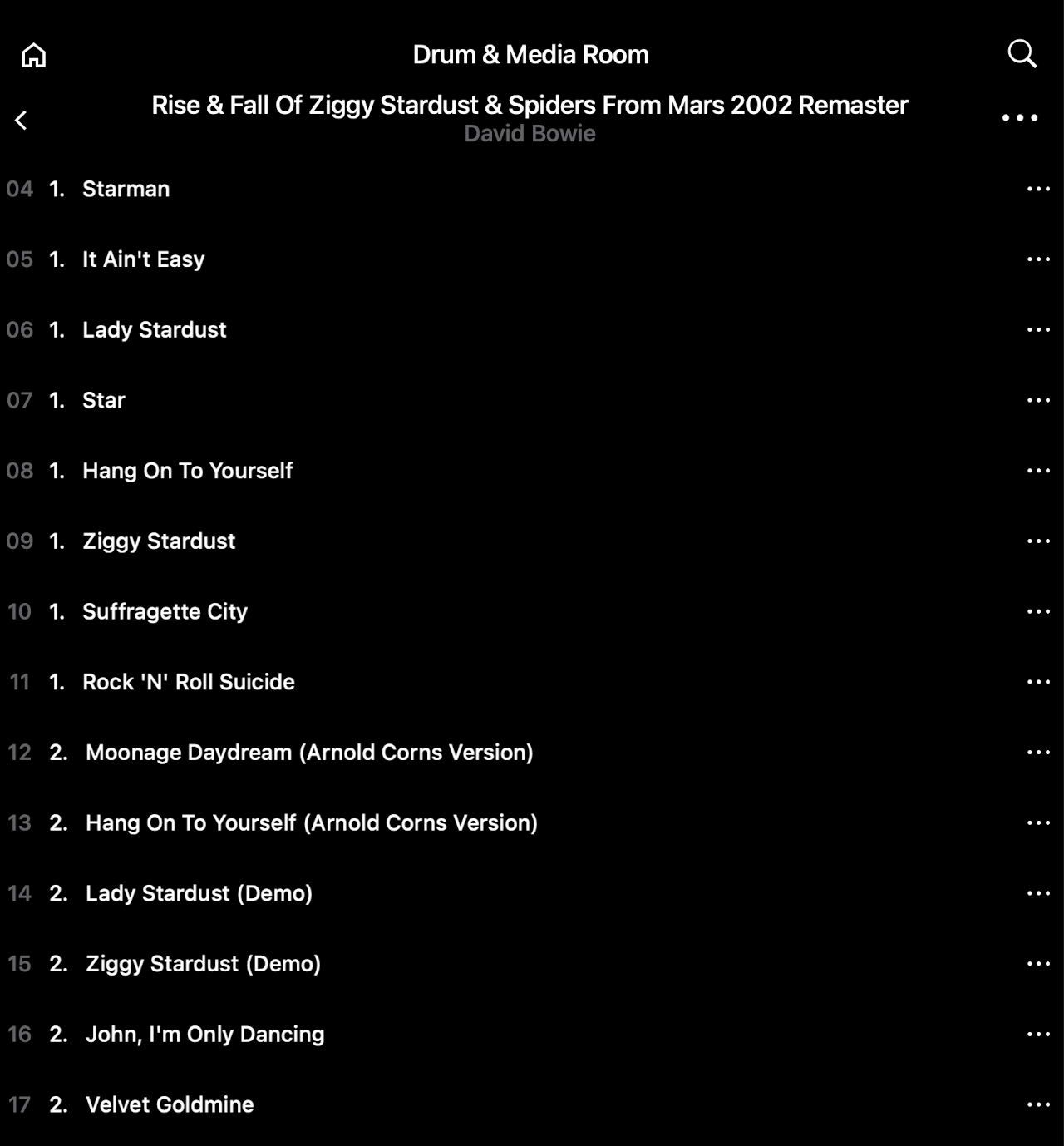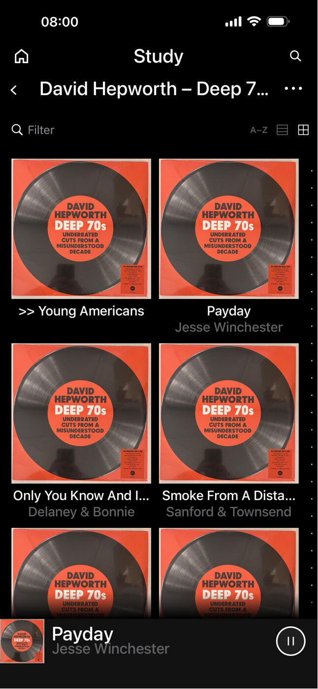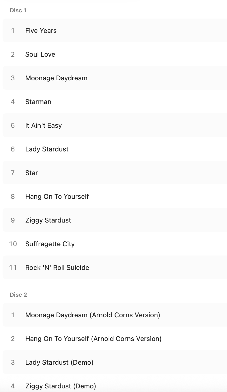 It has the >> Young Americans entry for the first disc followed by all of the first disc tracks, then >> Disc 2 etc. Clicking into this then allows me to play just the tracks from disc 1, and I can do the same for the other discs by scrolling down to find the >> entry. (Holding the >> icon then clicking Play doesn’t seem to work, you need to click through.)