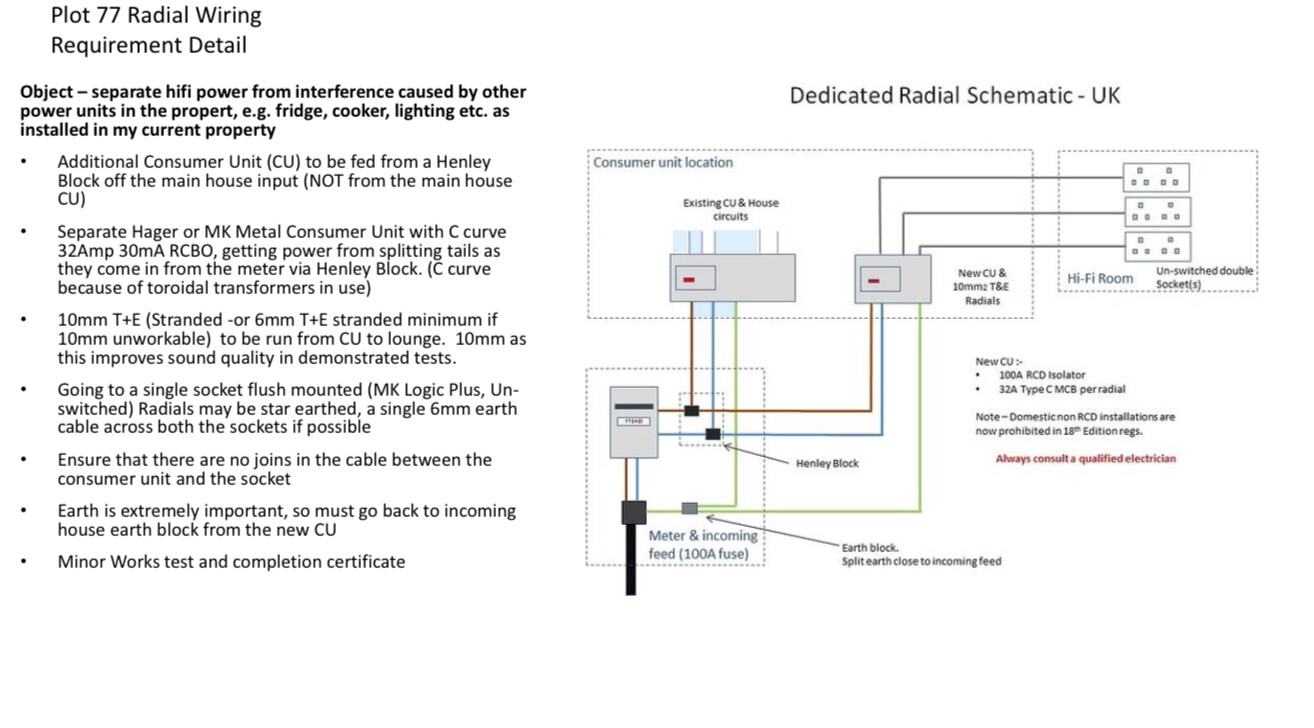Two years ago I moved into a new detached house and had the opportunity of specifying a dedicated radial for my Naim system, I’d experienced some hum in my previous property so wanted to address that and wring the best sound quality possible from my sytem.The radial install followed previous advice on the forum and the attached diagram, terminating in a two socket mains outlet in the lounge.