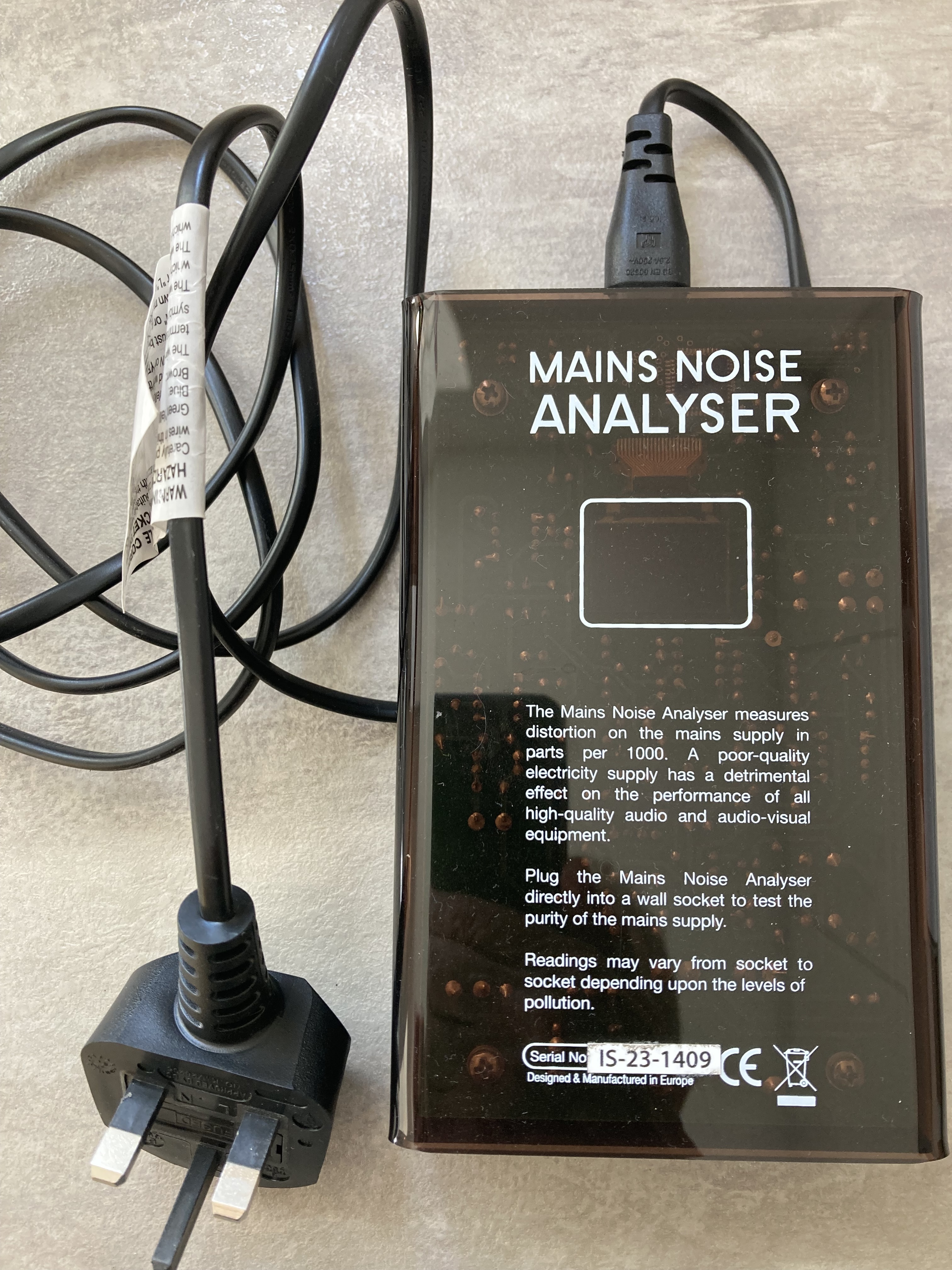 Recently I was at a local audio dealer, not a Naim dealer, and I mentioned the humming. He’d recently taken a loan device from a supplier ‘ IsoTek Blue Horizon Mains Noise Analyzer’ and he was good enough to let me bring it home and test my electrical sockets. This device has a standard UK 13 amp plug, you simply plug it into a socket, it plays back a sound representation of any detected noise and gives a reading of how much noise in parts of 1,000. The lower the number, obviously the better.