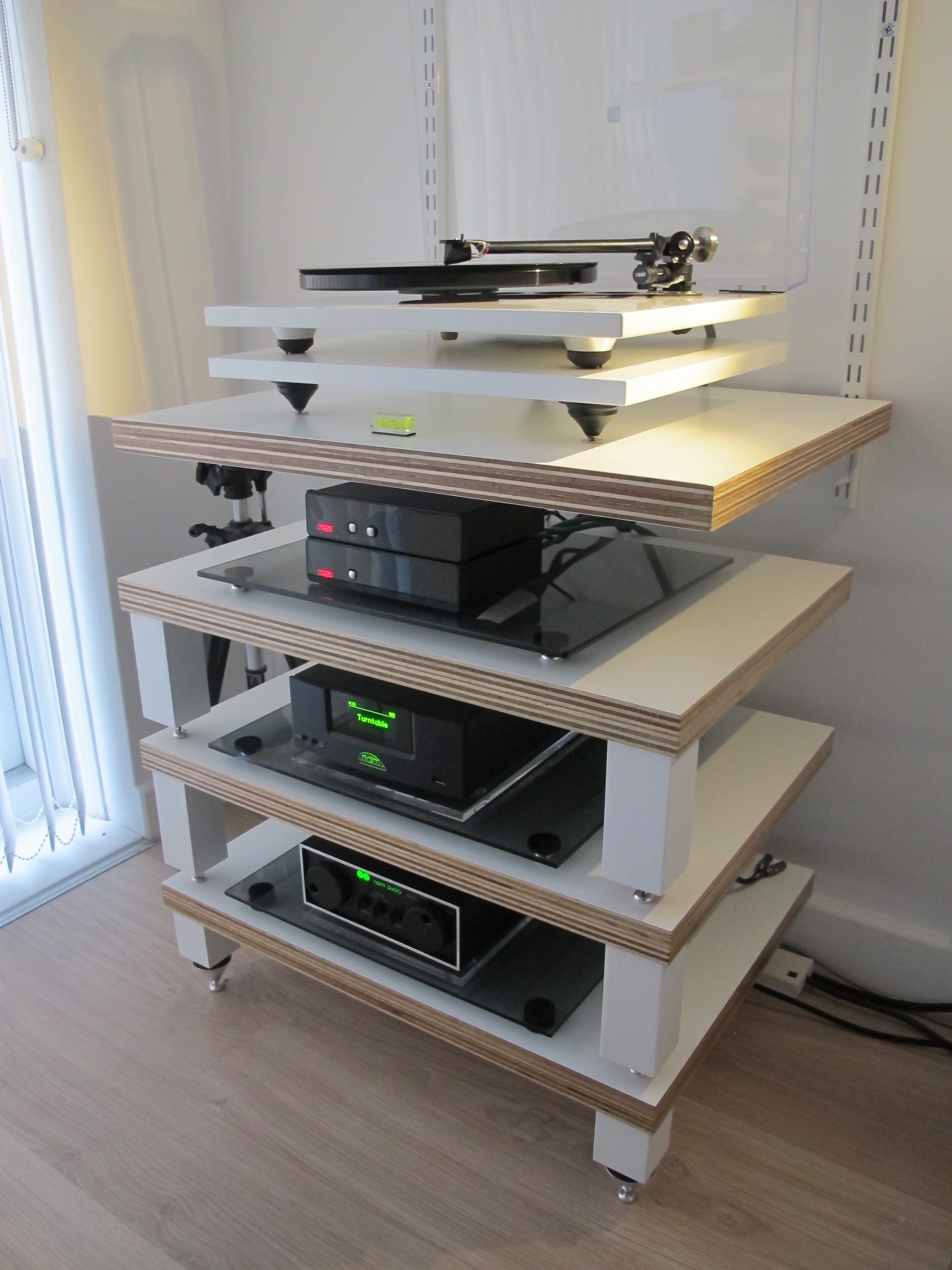 I built my own rack a couple of years ago. Based on the Hi-Fi racks designs, but using plywood as an alternative for solid wood (for rigidity), and three legs as opposed to four for ease of levelling. I was pleased with there result, but it was (very) time consuming as i’m rather obsessive about paint finish and this took quite an effort!