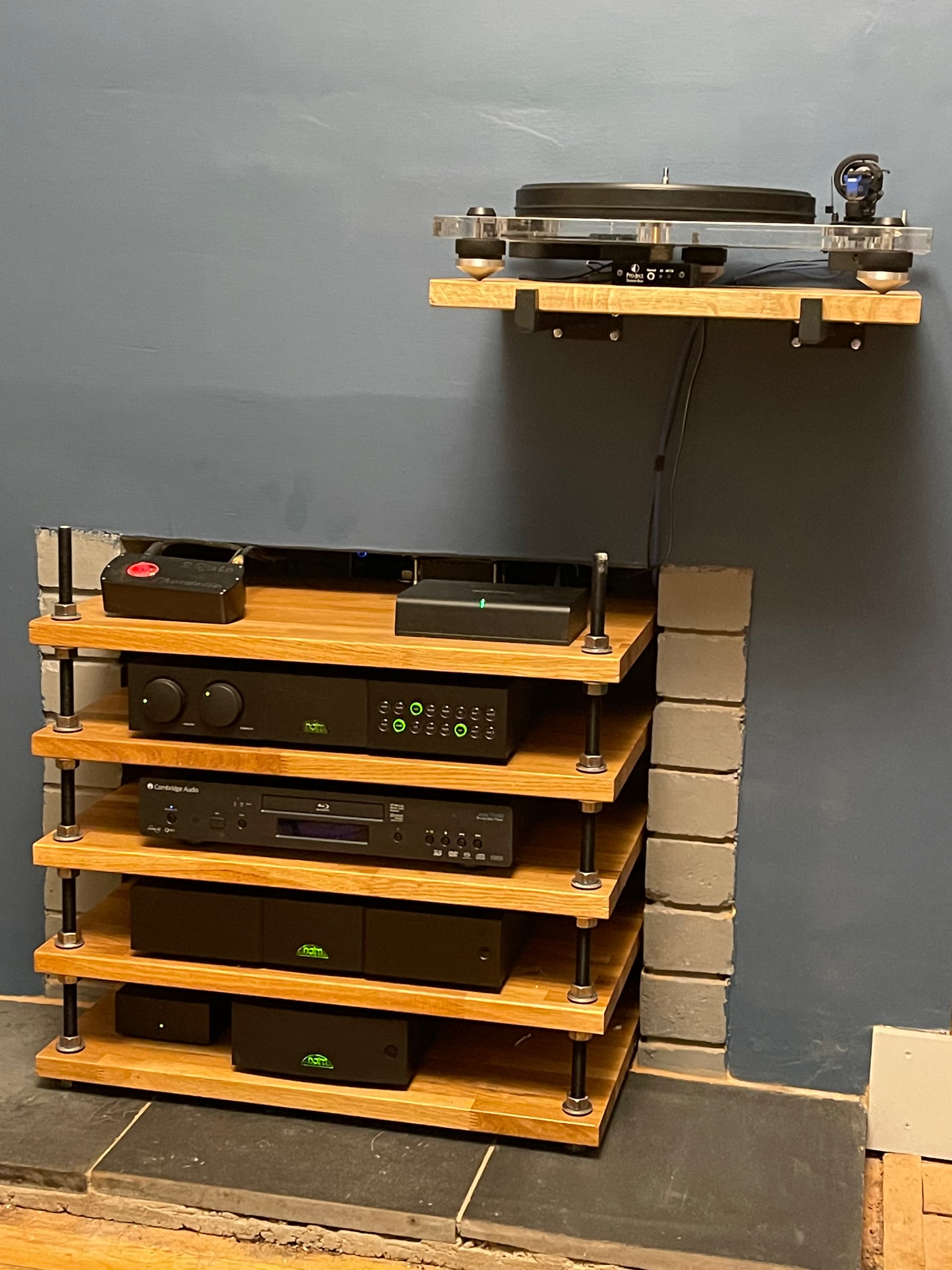 Well as I couldn’t afford a fraim I asked for DIY ideas and settled on a tnt flex. It’s three Ross, the back one is in the middle, I got 3 x 180x62cm wood from b&q got them to cut the rack shelves out and leave a 20cm x1.8m strip from each of the three pieces, £240 for the pad including all the shelves the turntable shelf, and have another isolation platforms spare along with another shelf.