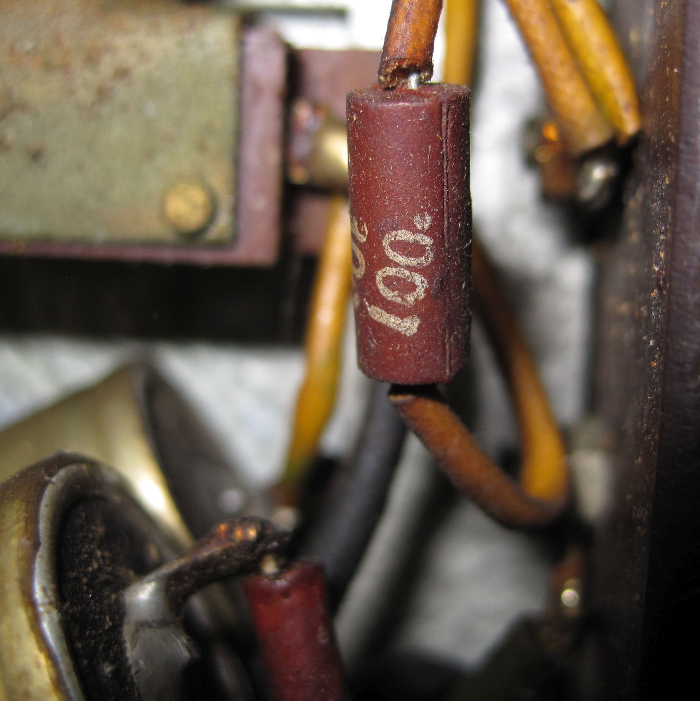 At this point, my knowledge starts to fail. I’m guessing it is a synchronous motor. There are two Hunt 0.75 microfarad capacitors in series and a brown “thing”, that reading up suggests is a resistor.