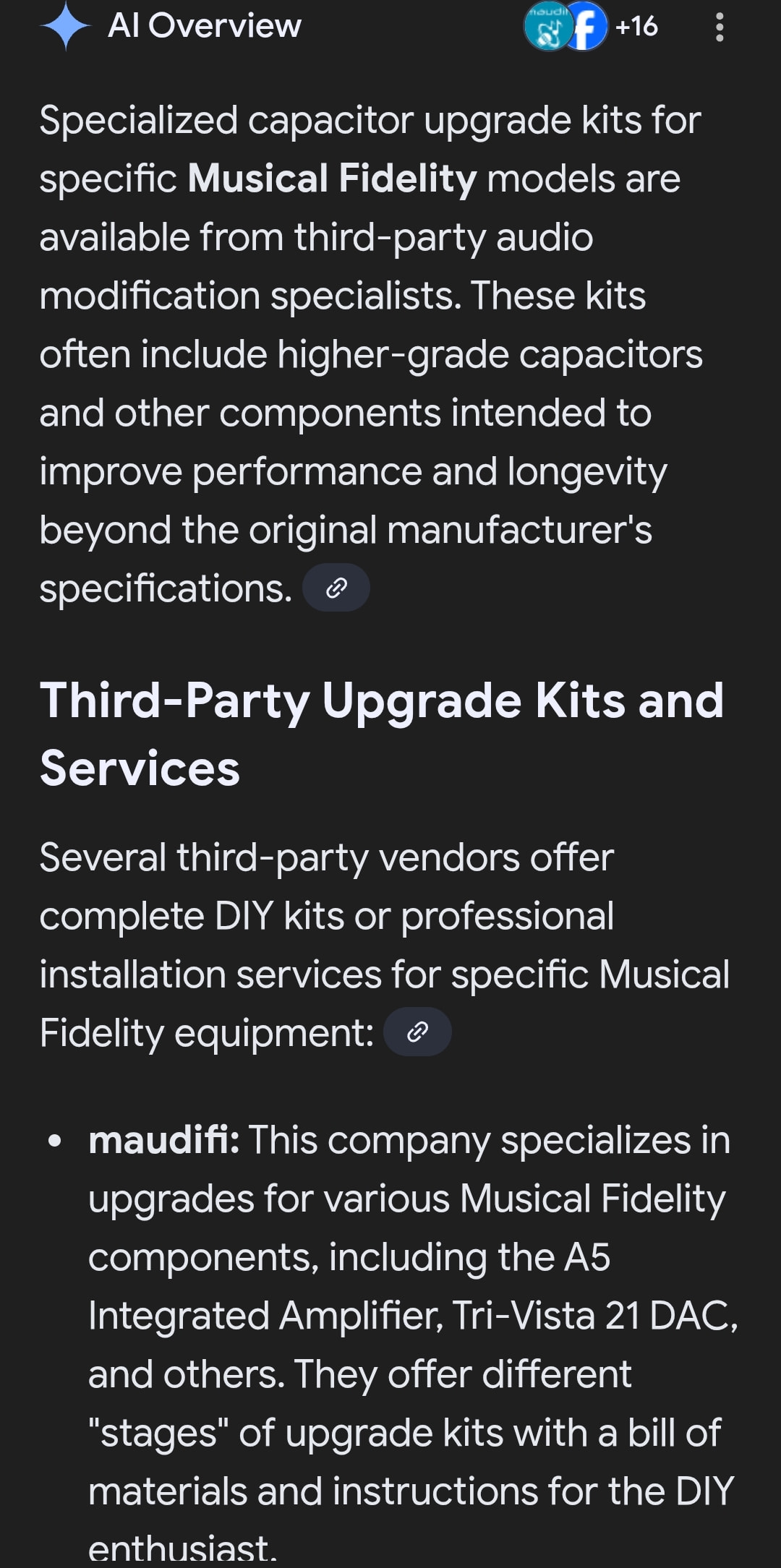 It’s interesting that you pulled that up from AI because I was looking at the same stuff which lead me to the OP. I also have a Musical Fidelity Tri-Vista 21 DAC that I’ve had for several years. It was when looking at Maudifi’s videos on you tube I was wondering if I should re-cap it. From memory I bought it used for about £800. Maudifi sell kits to re-cap and modify it at various stage of upgrade. The bill of materials for the stage 3 upgrade would cost more the DAC cost me initially. It also mentions the Rock Grotto upgrade for the X-Can. Mine packed in and I replaced the valves and recapped it myself for a lot less than their kit (which didn’t include the tubes) and I still have it in use. It must be 20 years old now and probably worth another recap but can’t say I’ve noticed degradation in sound quality. In fact I prefer it over my Headline. Seems like there is a very lucrative business in servicing hifi equipment that may or may not be purely nugatory.