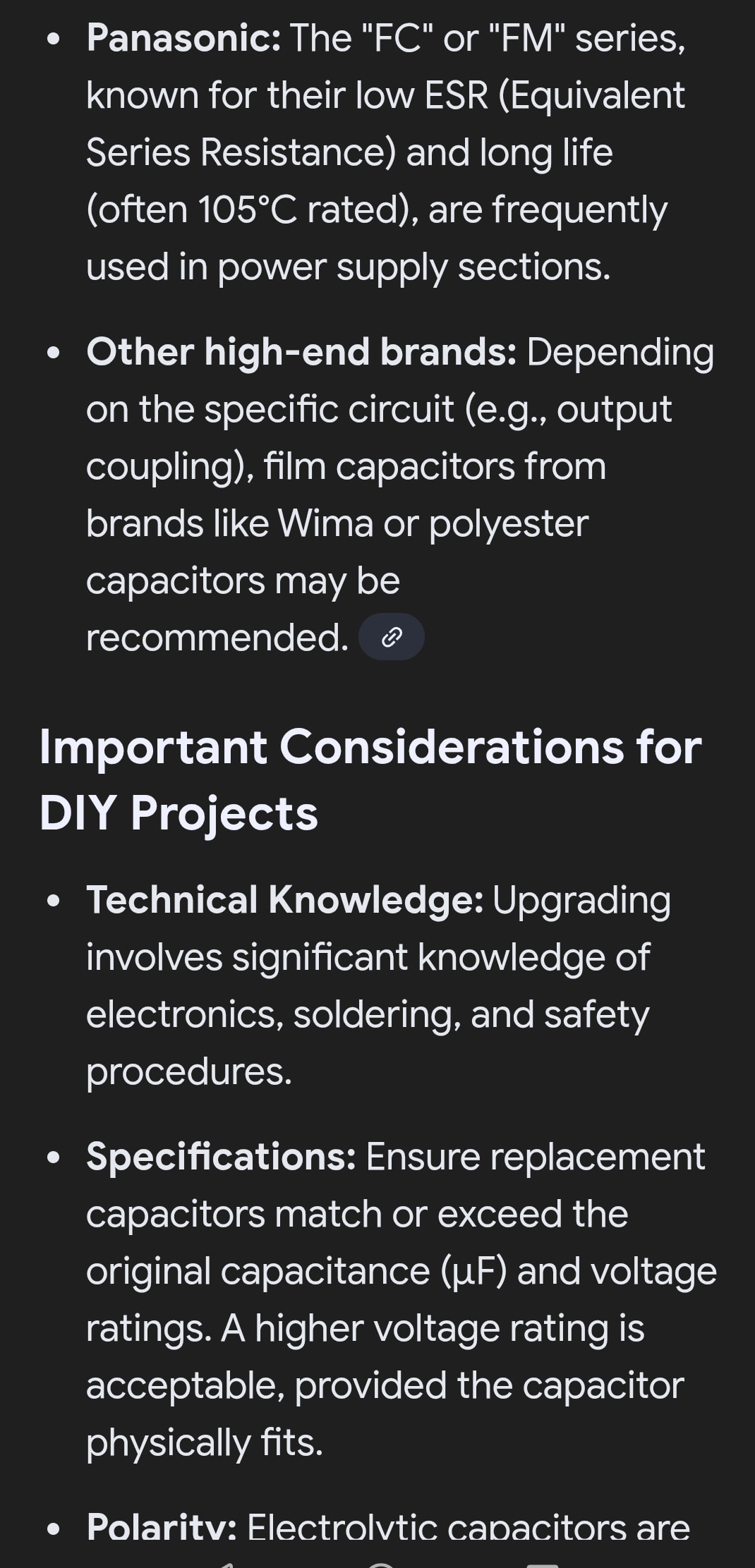 @Loki. I know they do but when unpowered? @Robinho says they do but much more slowly. The units I’m thinking of moving on are Musical Fidelity 3.2 pre and power amps. They were the British made one’s before they shipped out their manufacturing to Taiwan. However, I believe they didn’t use the best capacitors available when they were British made. I’m thinking maybe I should give them a listen as is and then re-cap them myself if they sound a bit flat. A visual inspection is one thing but, unless they’re showing obvious signs of bulging, it won’t tell my if they’re shot or passed their best. What characteristics in terms of PRaT will they exhibit if they’re buggered? My soldering skills are good so I’m happy to replace them myself but don’t want to do that if they’re OK. There are different types of capacitor of course and then there are specific specialist audio ones but I’ve really no idea what makes one better than another. There’s a big difference in cost. What are you paying the premium for?