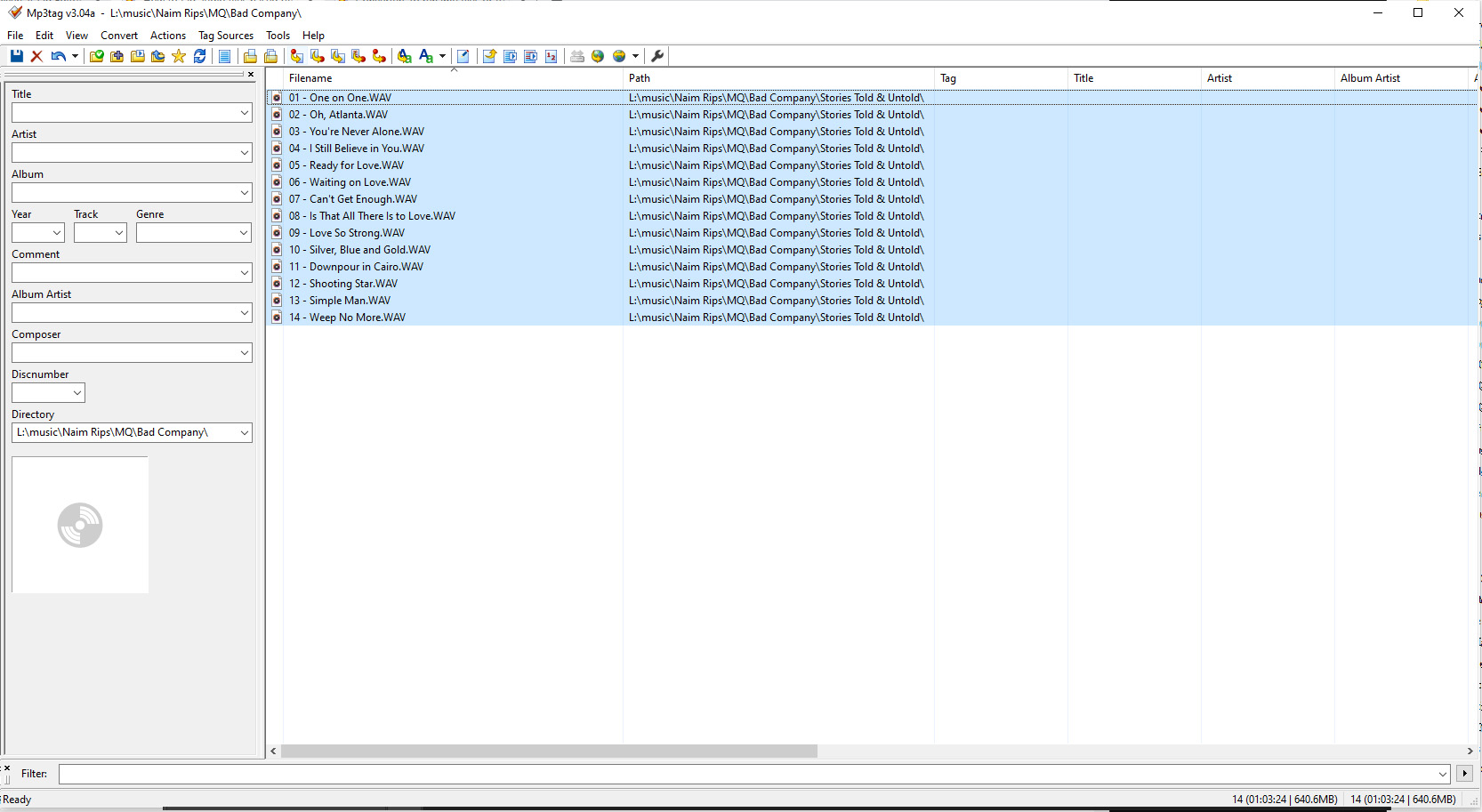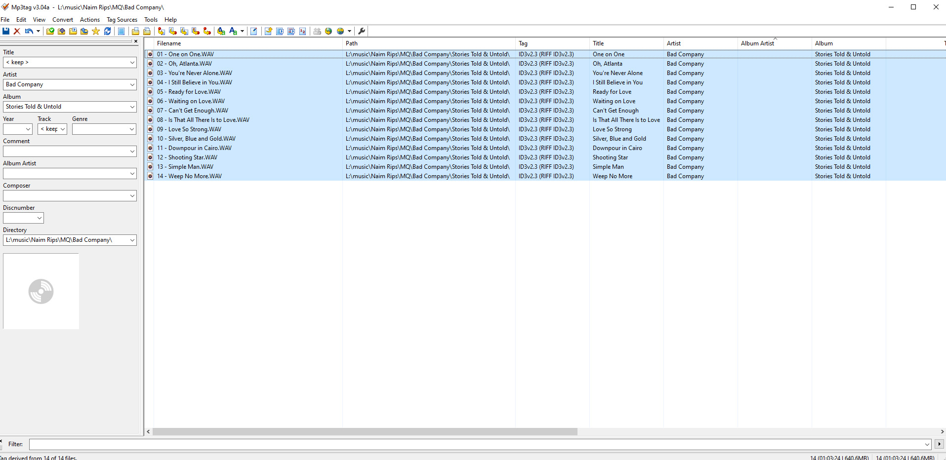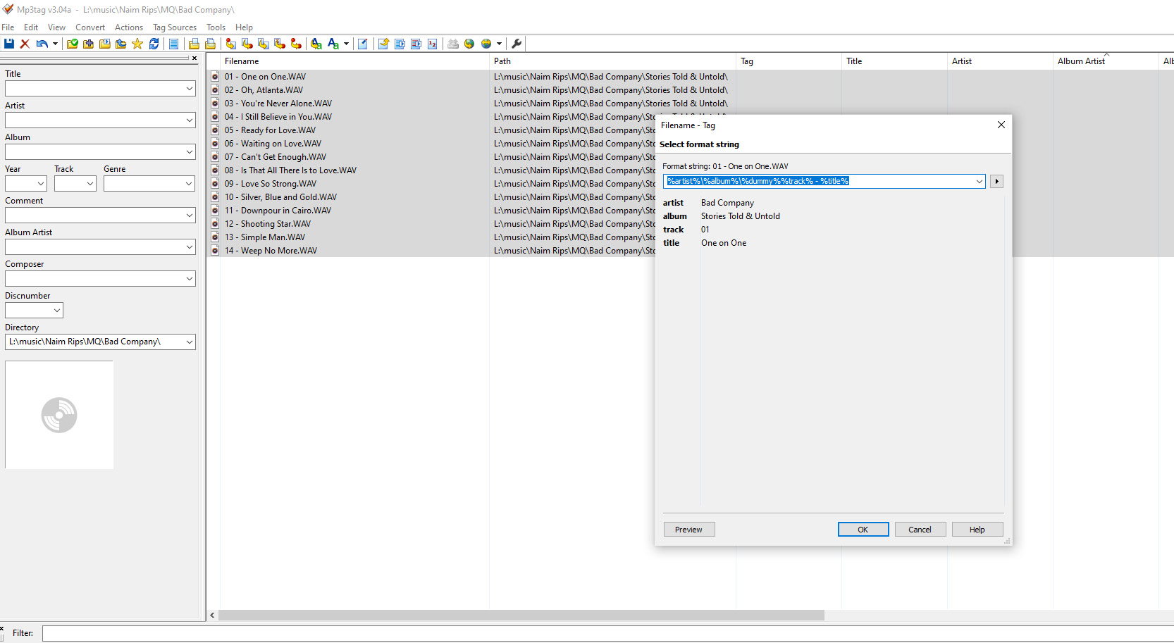 Now when you run another server over it, it should pick them up just fine. You can do multiple artists folders at a time, I went through my library by artist letter, I noticed MP3tag woul dcrash if you gave it too much at once, that being said a few suns have set since I used it in anger!
