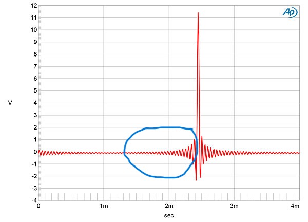 As can be seen these are Linear Phase (symmetrical) impulse response with what I refer to as ‘pre-echo’. For comparison, included below is the Stereophile review and measurement image of the impulse response of the Chord DAVE DAC. The blue circle (added by me) identifies the region I call the ‘pre-echo’.