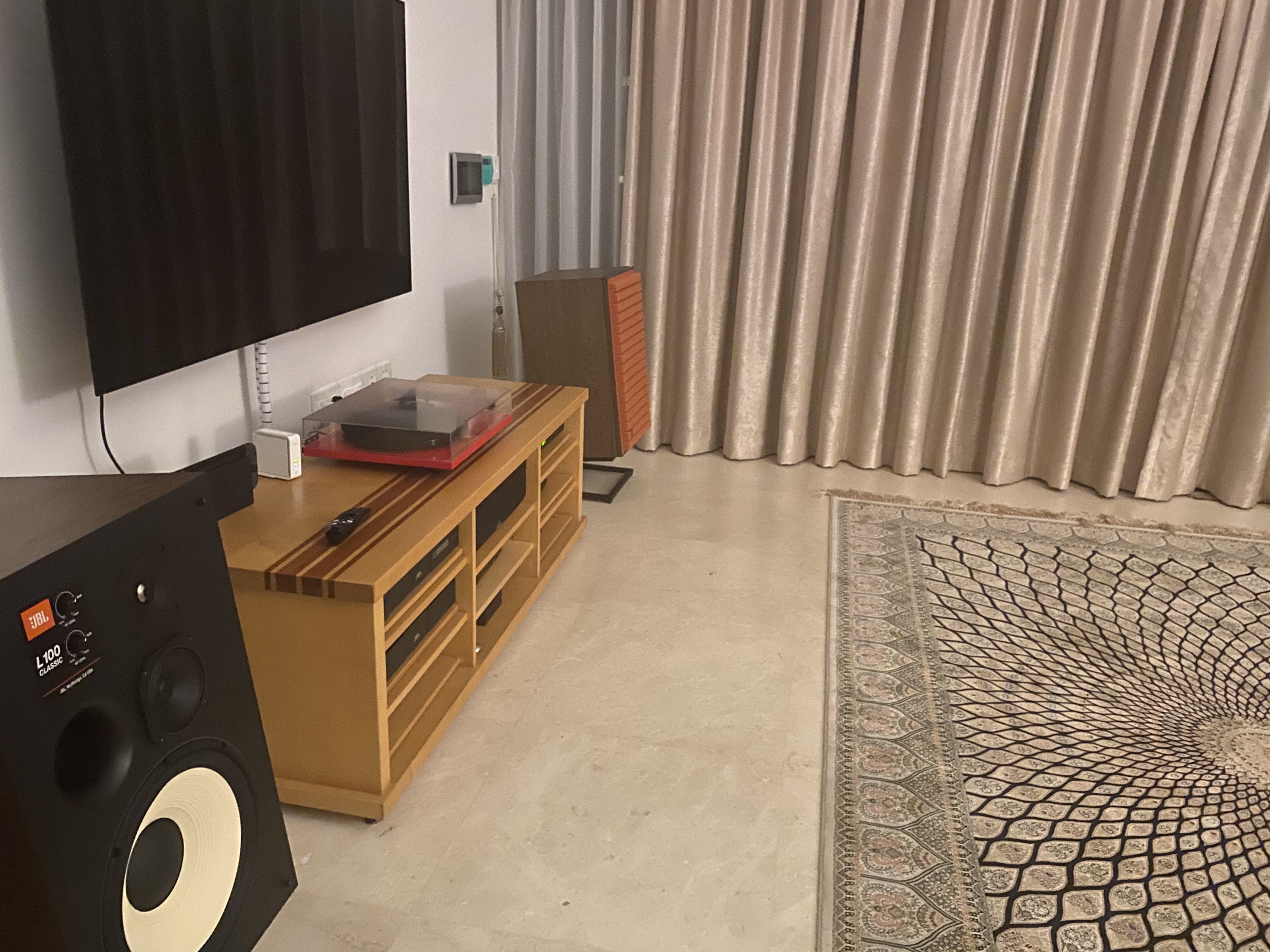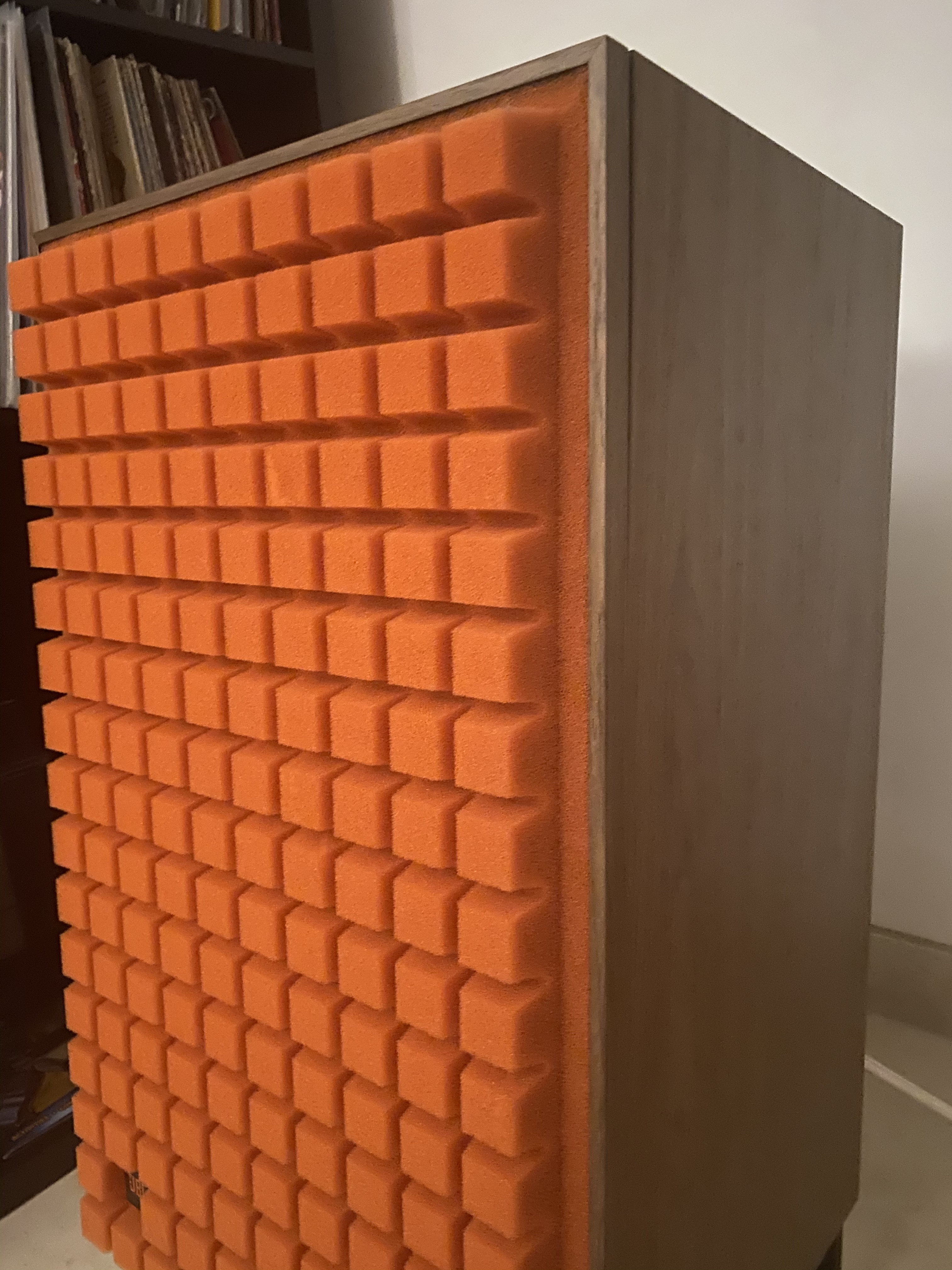 Build quality – no complaints, big walnut boxes, weigh about 30kg each on the JBL stands. Directly in front they sound better slightly angled in, but I found this sounded a bit muddled in other parts of the room which was solved having them straight. I even had a play with the dials, god forbid – no major change off standard for me.