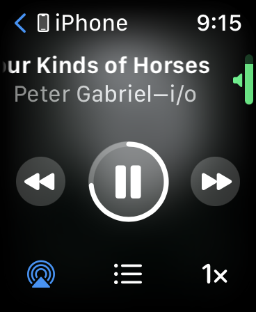 Another way, is via the Apple Watch, if you have one. When playing to a BT device, the watch will automatically display the current playing info and volume control is possible by turning the Watch Crown ā Volume indicated by the green vertical barā¦again, this gives very fine volume control ā too much so actually, as I find you have to spin the Crown a couple of times to really ramp up or downā¦.