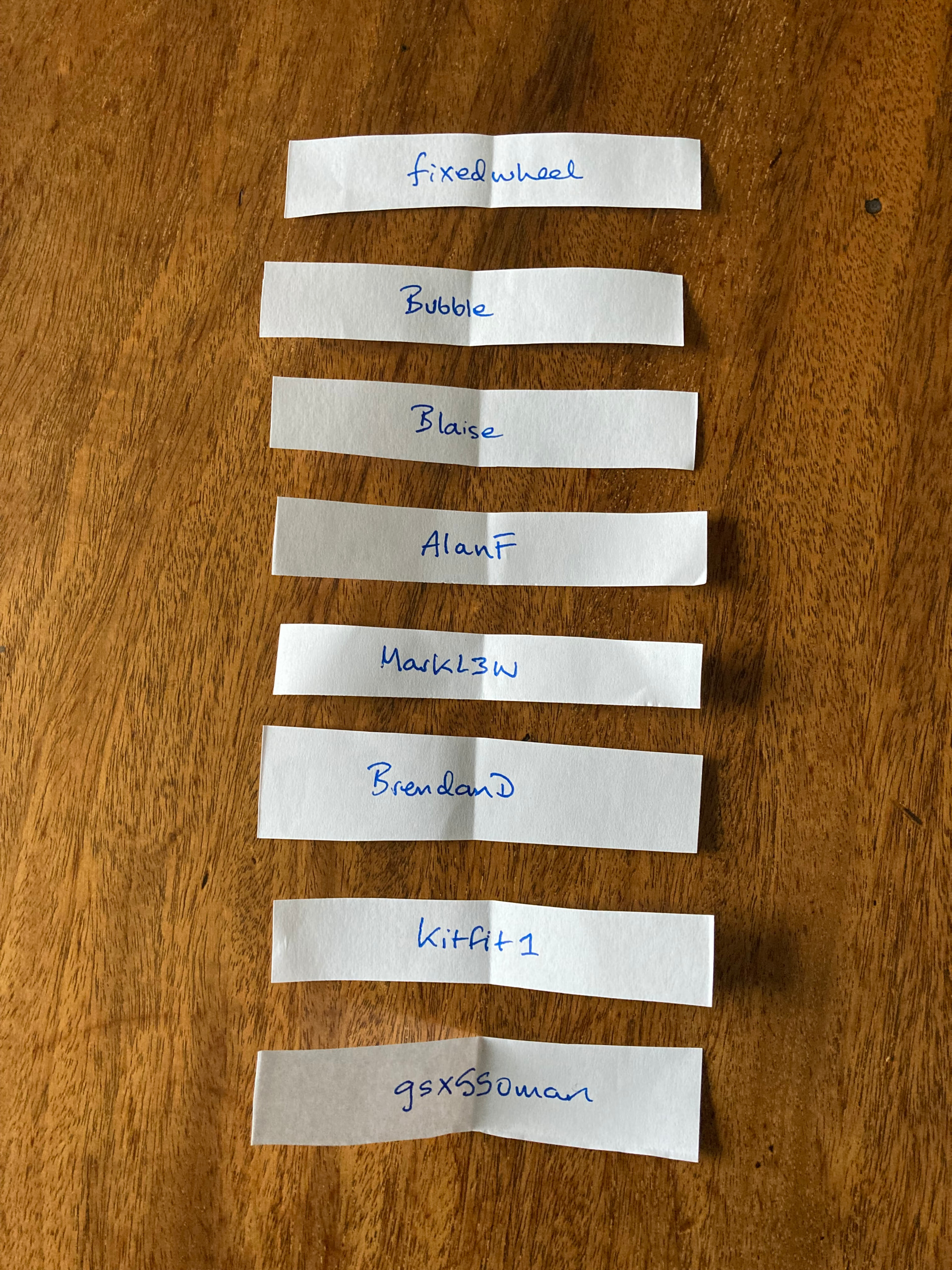 Thanks those of you who have responded so far. Still awaiting word from @Kitfit1 @Bubble and @fixedwheel so please let me know as soon as you can - thanks!