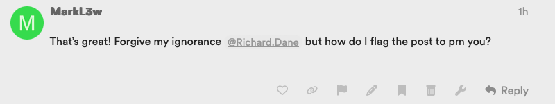 Thatās great! Forgive my ignorance @Richard.Dane but how do I flag the post to pm you?