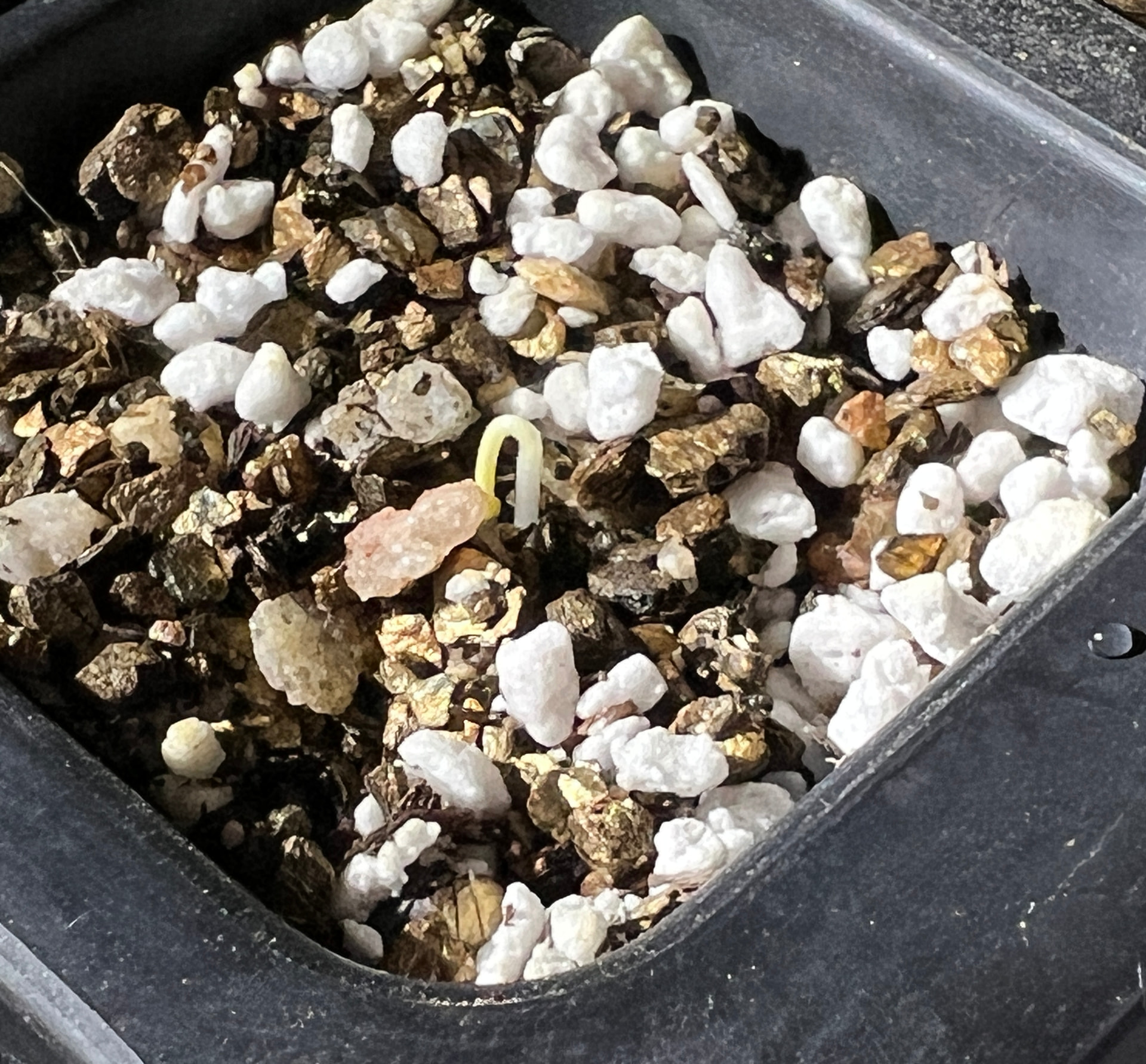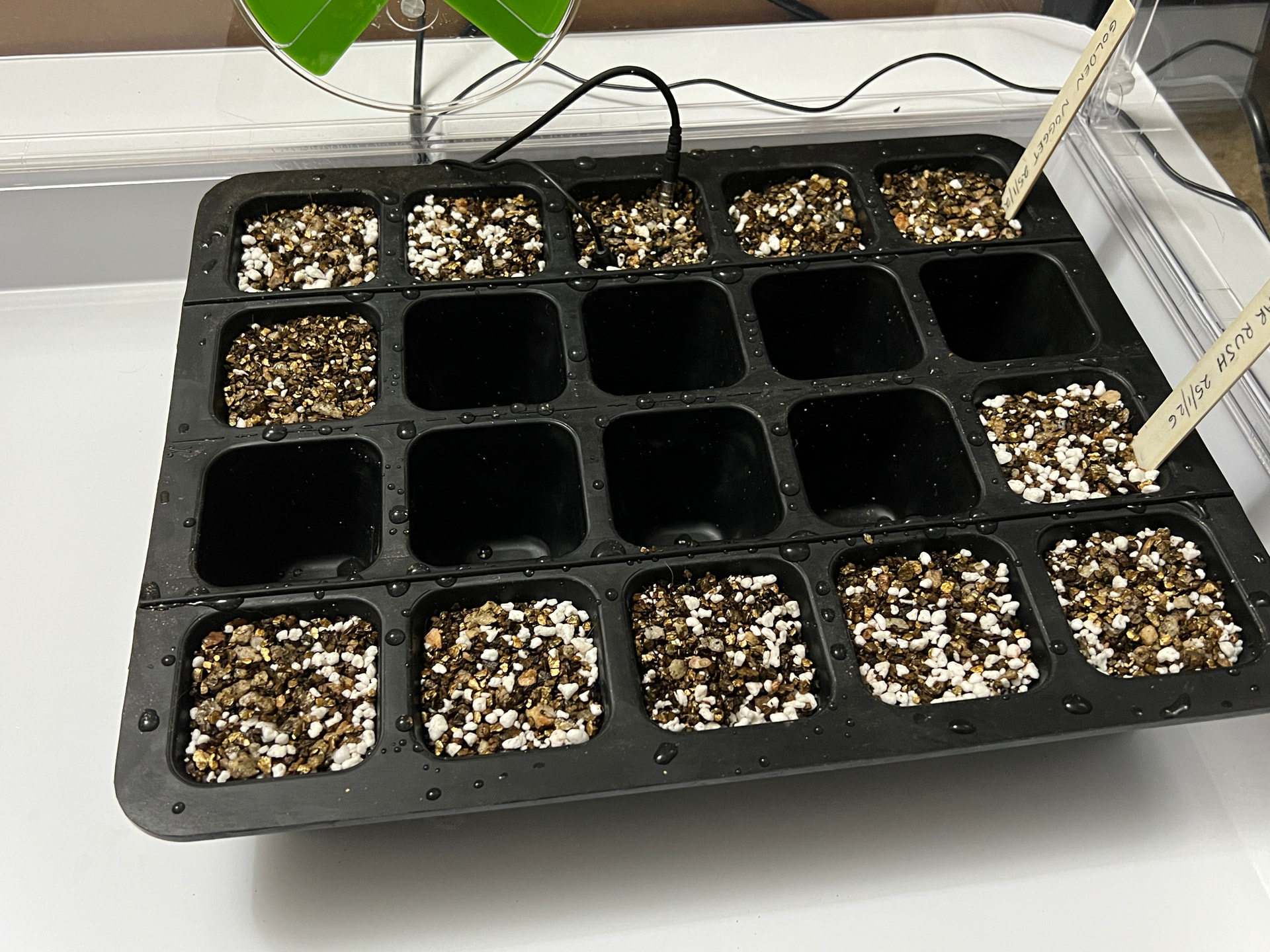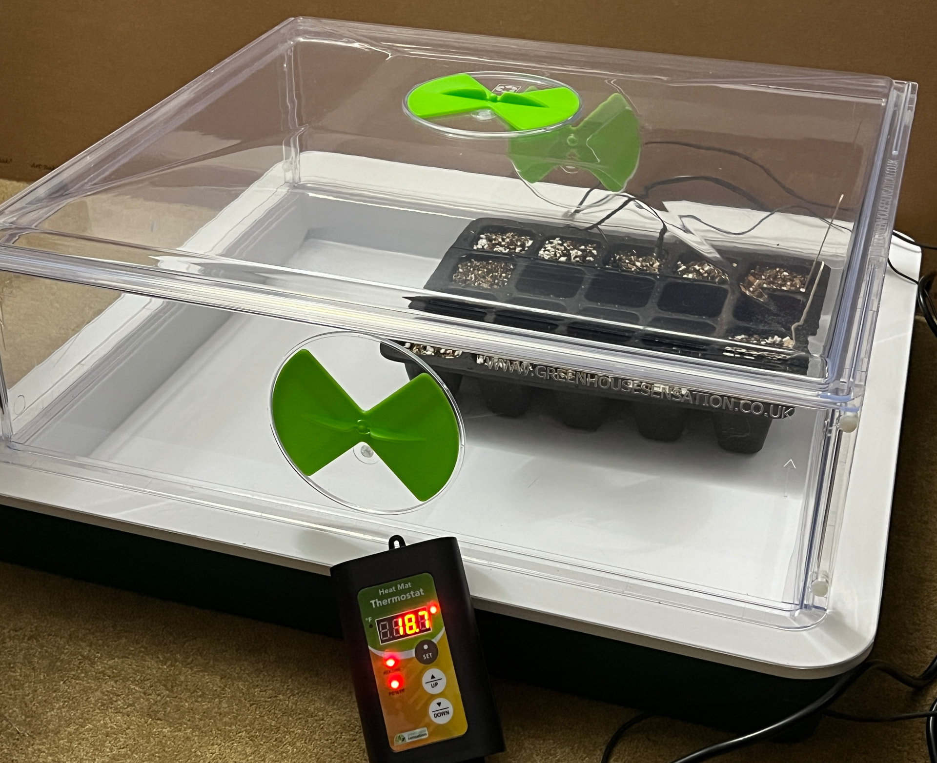 Rubbed some food-grade silicon grease into the rubber tray before planting the seeds and placed in the propagator, setting the thermostat probe to 29c. This precise temp 24/7 was the big difference last year.