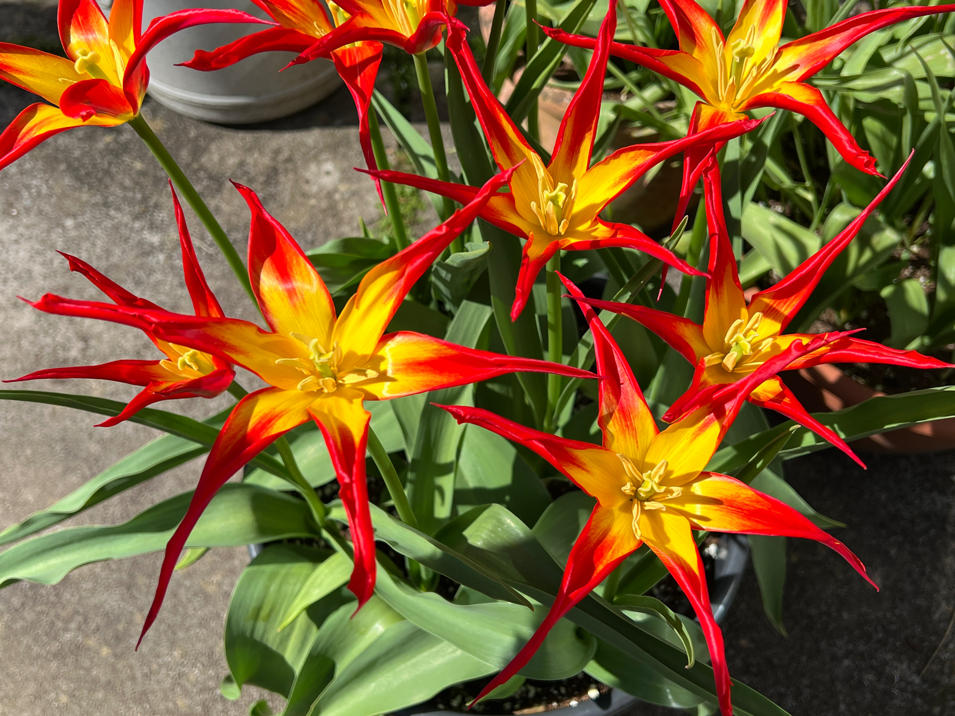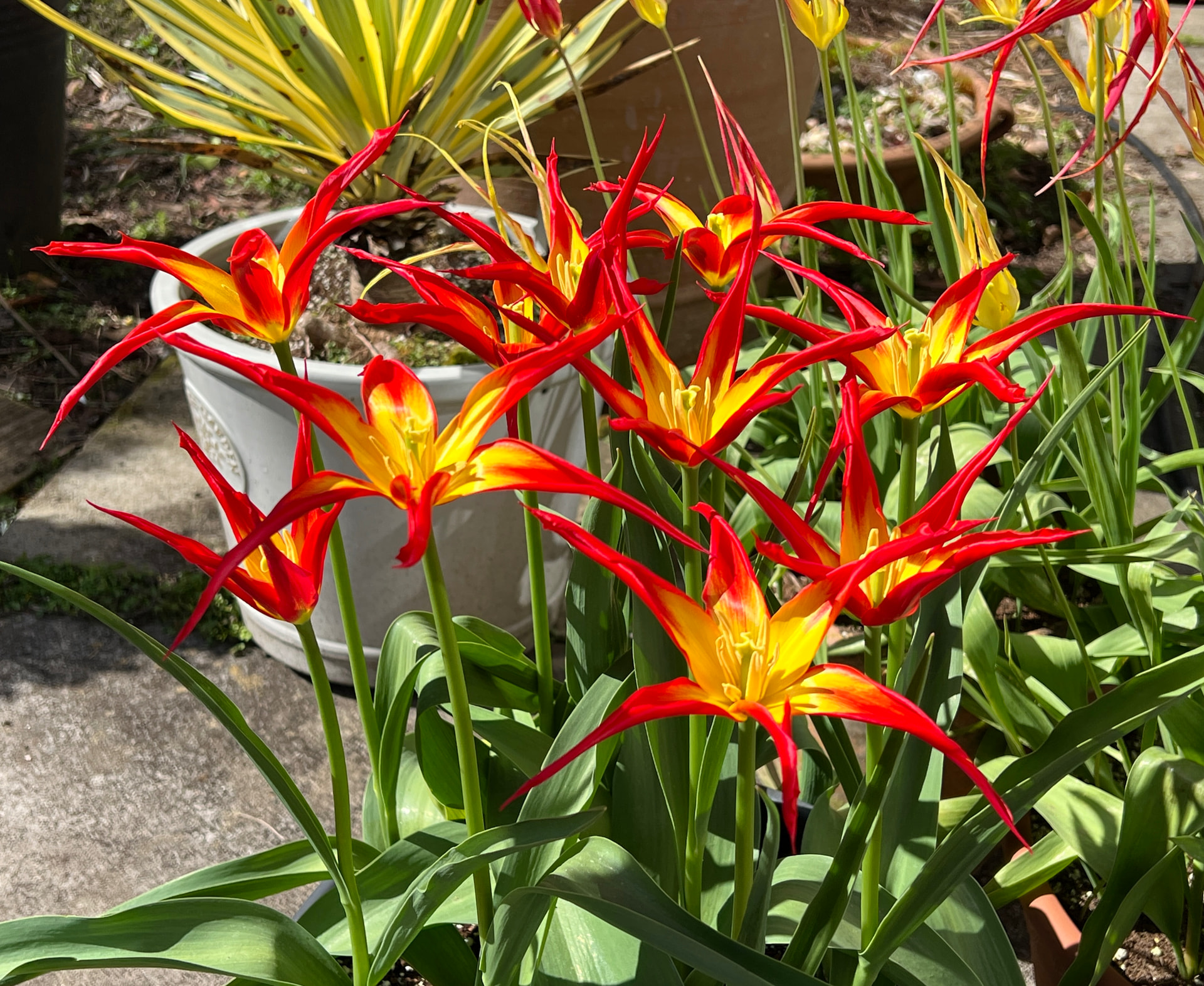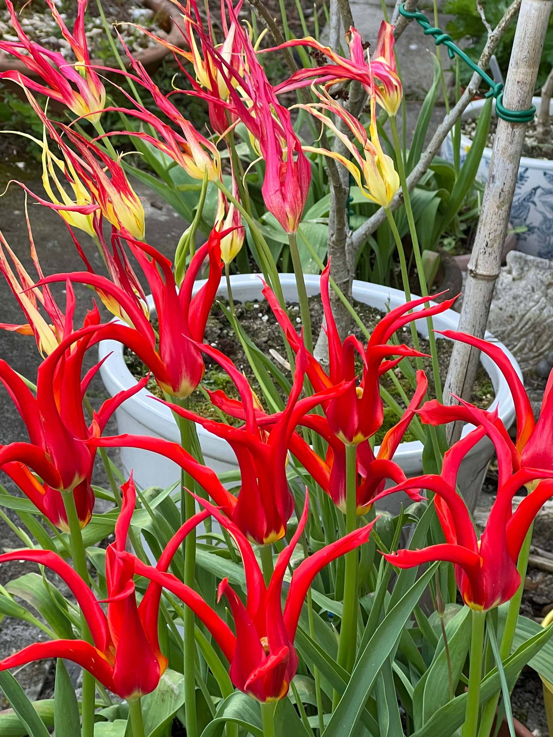Tulip acuminata comes up reliably every year. Getting too many of them now. Look great even when they’re closed.