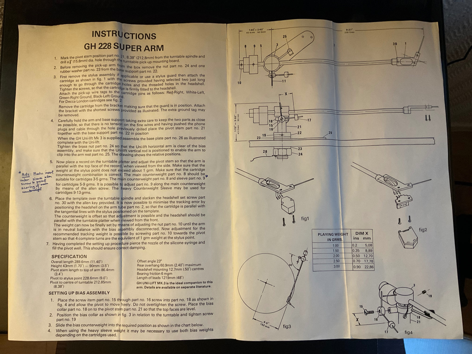 Thanks, I have a Shure V15 HE ready to attach, plus a couple of Ortofons. Do you have any instructions/advice regarding the positioning of the outrigger weights? Also the arm/hook for the bias wight is the version without the loop and has does not have a pully so I’m wondering if I’m missing that