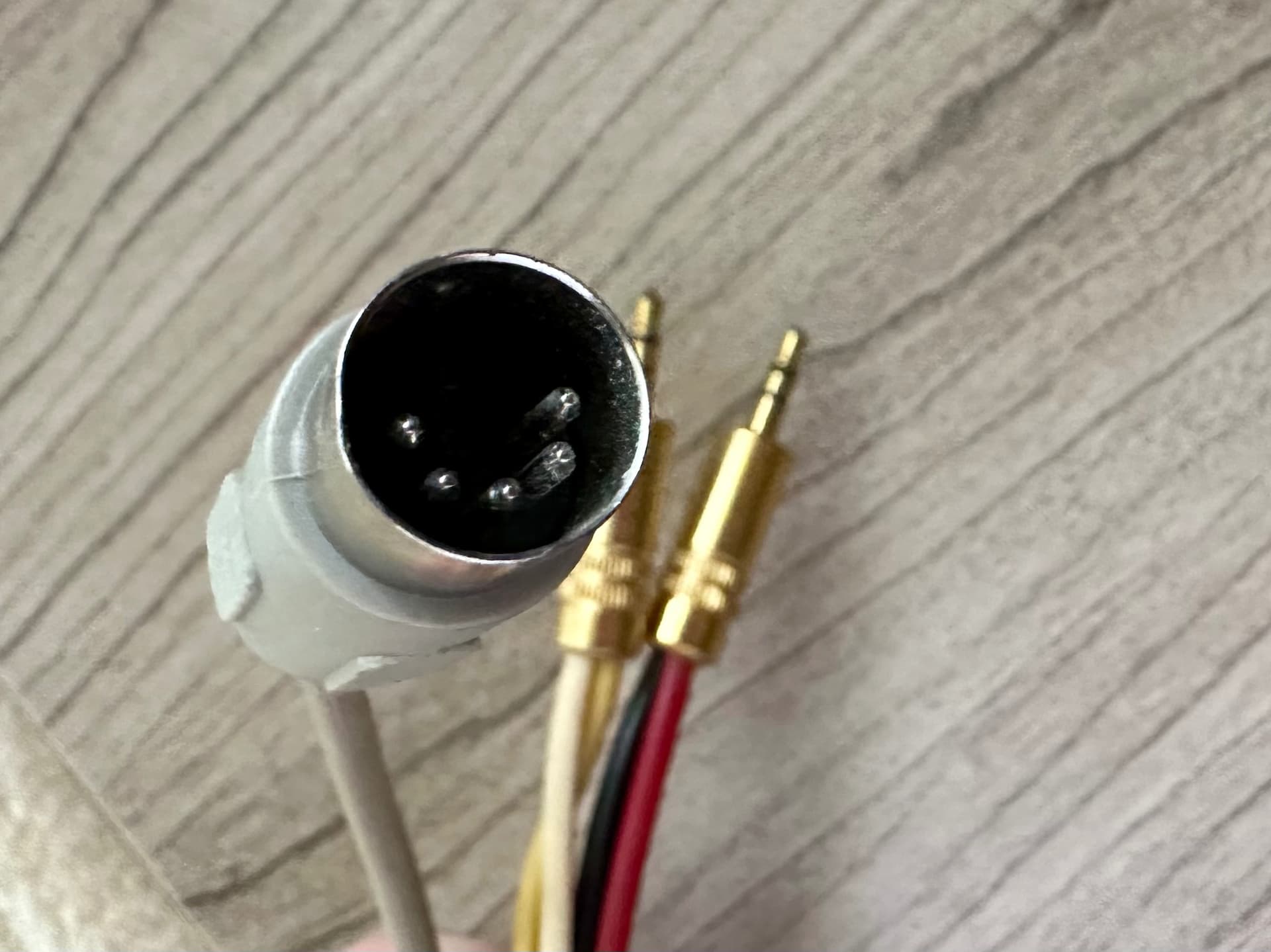 It looks like one of those old generic RCA - DIN tape patch leads where someone has cut off the plastic bonded RCA phono sockets and soldered on a pair of stereo 3.5mm jacks. This would have been done to connect a portable recorder such as a Walkman Pro or perhaps a small portable digital recorder.