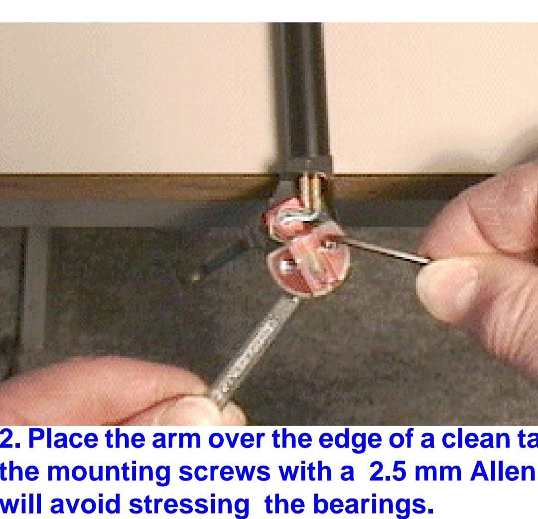 I think the need to remove the arm is to prevent strain on the bearings when you tighten the cartridge bolts.