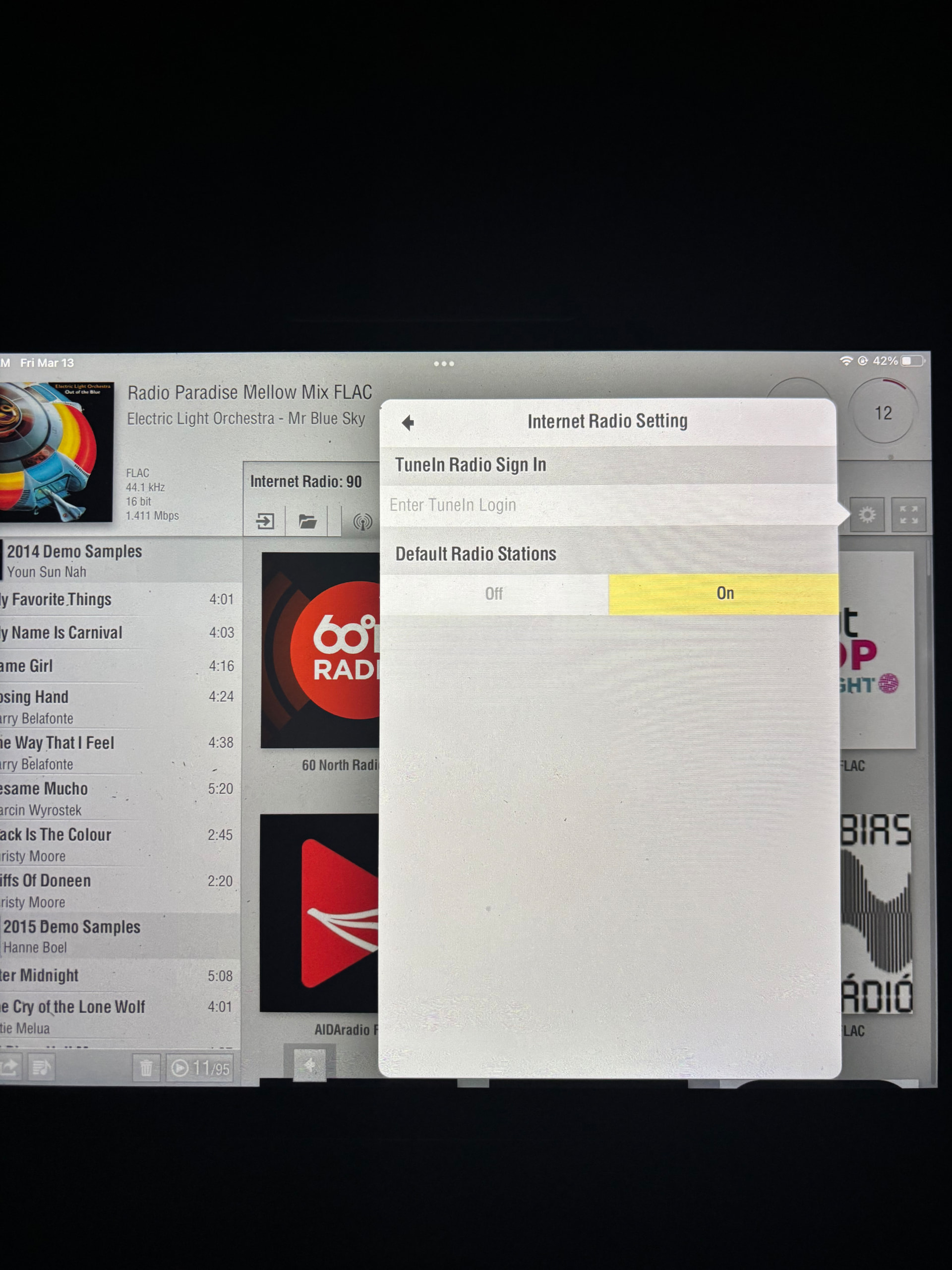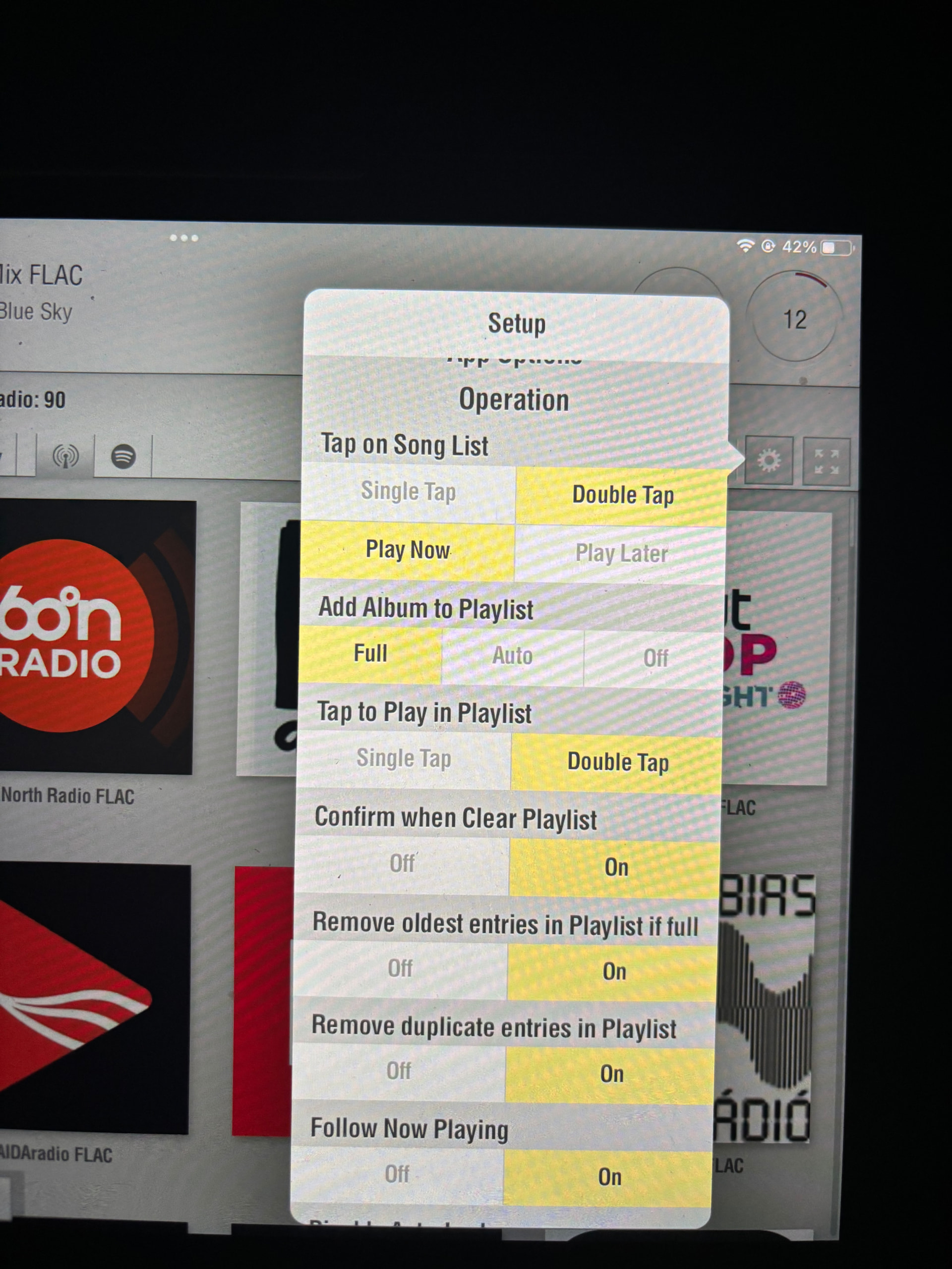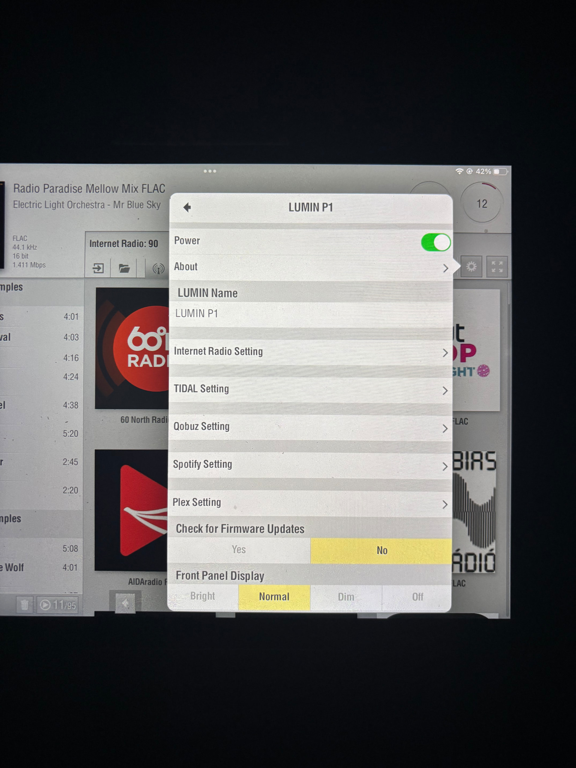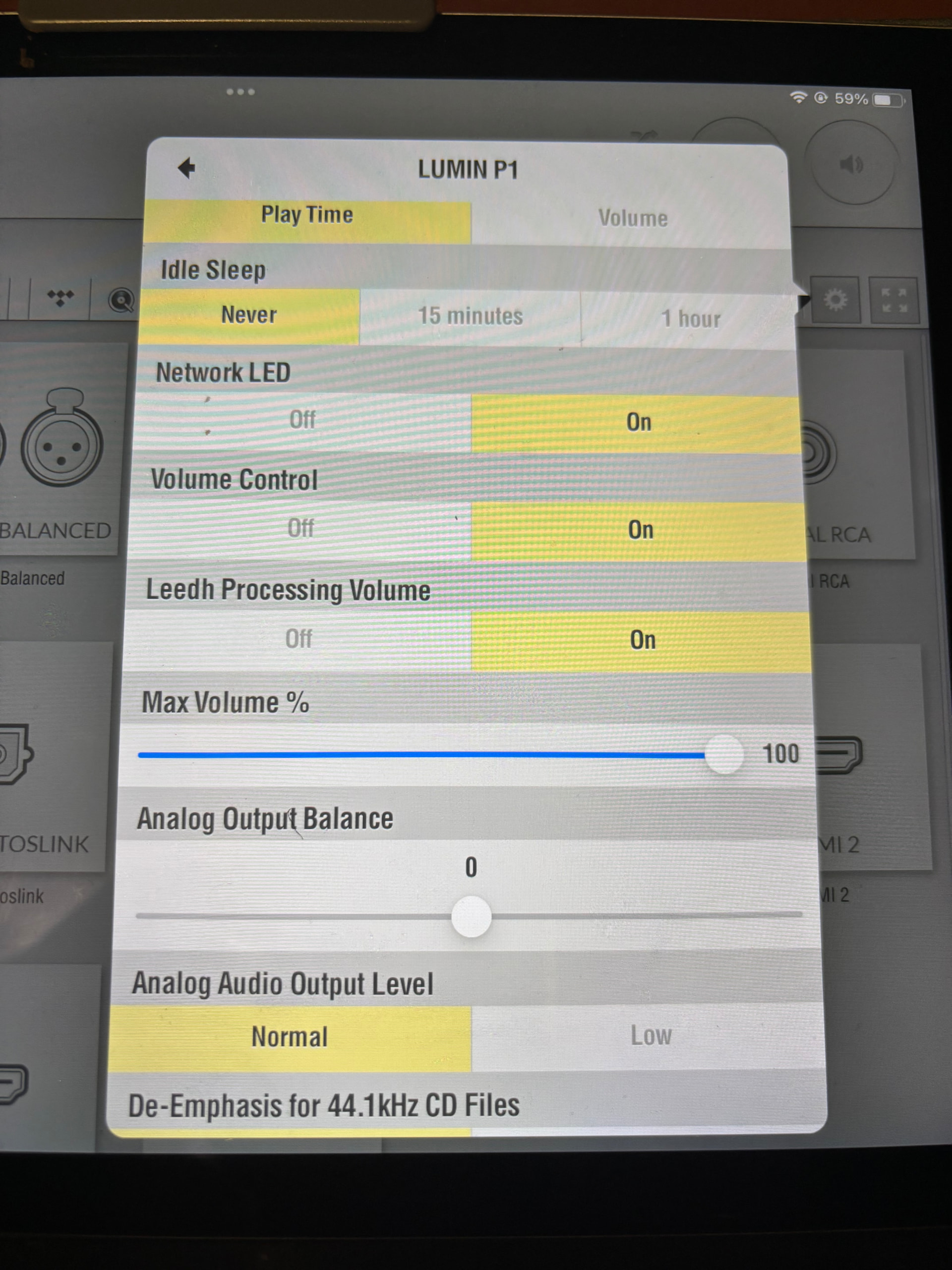 FR , I took a few photos of my settings. Have you tried internet radio yet? At the top right of screen you should see a running total of the time you have been listening and far right top is the current volume.