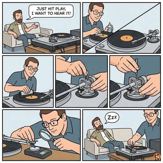 The thing that leaps out at me is not the speech / thought bubbles, but the guy having his fingers all over the playing surface of the record.