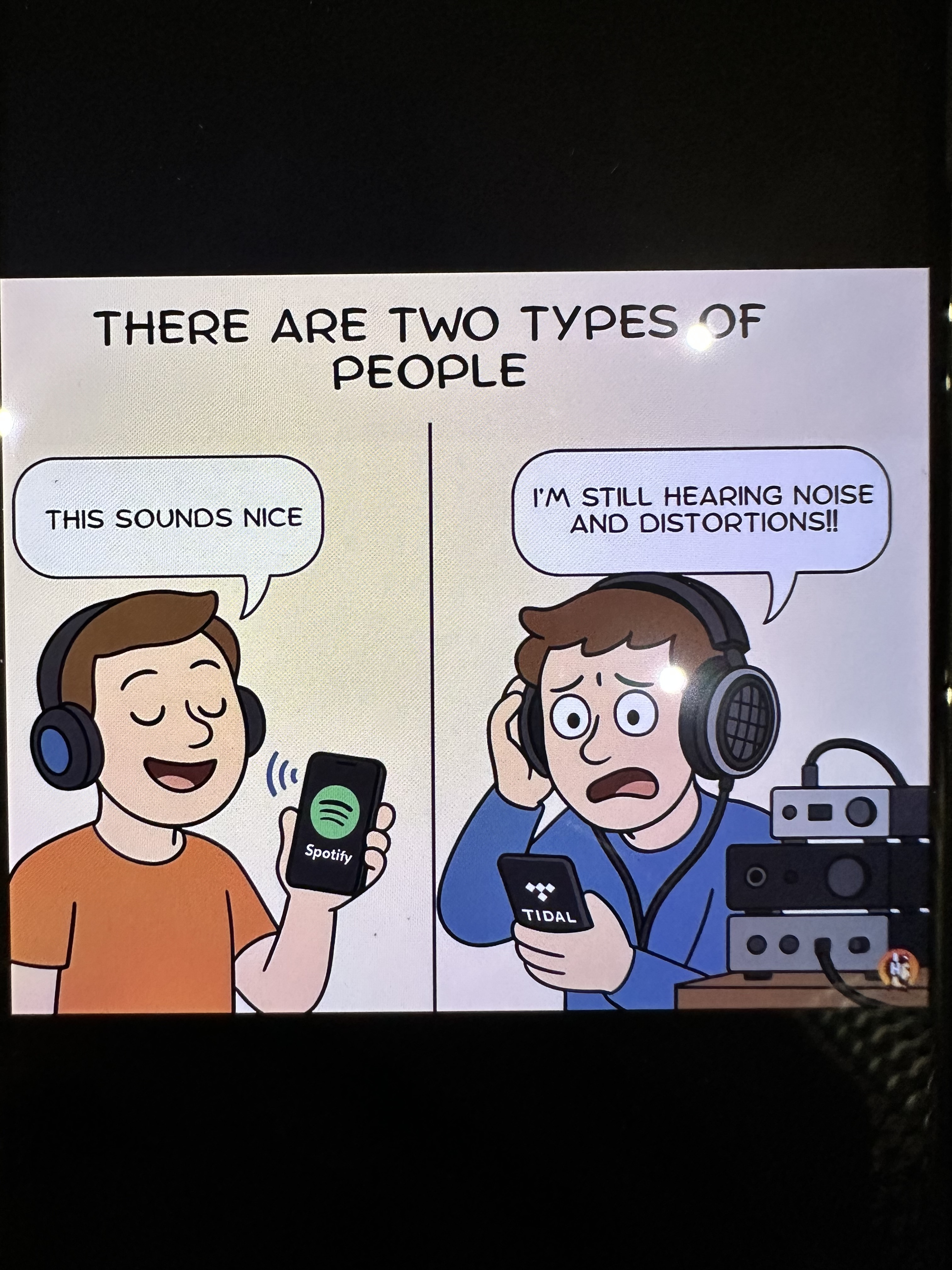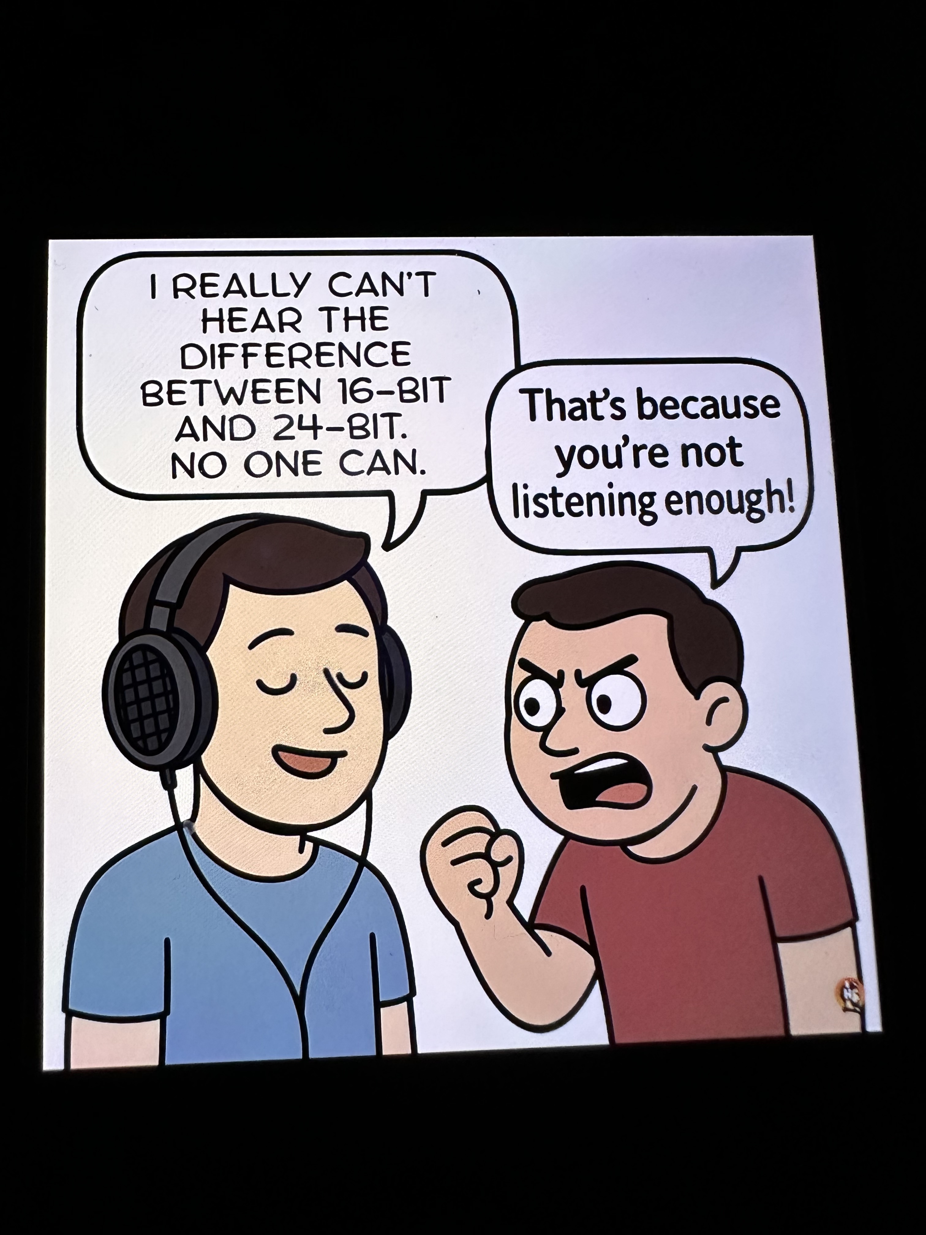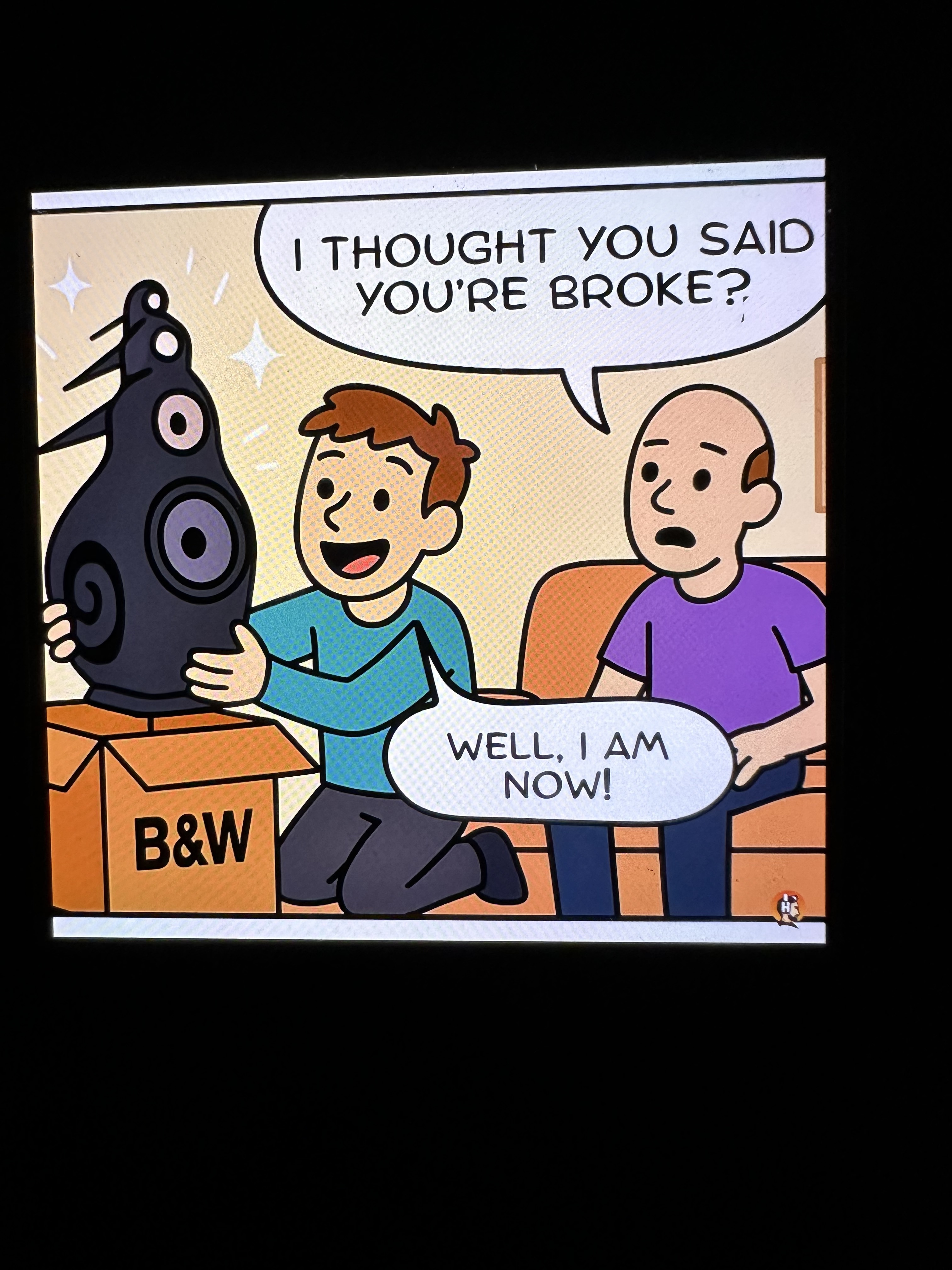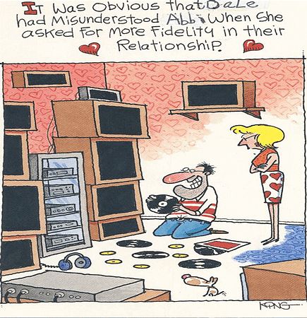 Les: “That’s just your untrained ears. I thought they sounded the same at first but then I realised even with my more refined ears I wasn’t hearing all this second system is revealing. Look at the salesman, who of course is very experienced as he listens to so many systems all the time: His foot has been tapping so much more with this system, clearly he’s hearing beats between the ones even I can hear. And on the last track his foot started tapping wildly a second before I heard anything at all!”