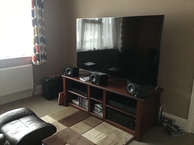 As for speakers, originally it was a Tannoy 5.1 FX, which has mini āsatelliteā type speakers for 5 channels - L & R mains on stands that look a bit like microphone stands with spiked glass bases, centre sits on the radiator immediately below the screen, on a drink mat for heat insulation, and L/R sides ate hung direct on the room walls. Rear speakers are Wharfedale NX flat āpicture frame) speakers on the wall which is well behind the prime viewing sofa. That changed during COVID when I started streaming opera from NY Met, which revealed the, poor sound quality on music, so mains are now fed from the Sony through an old MF preamp to my hifi system active speakers, which for that purpose sit right at each side of the screen. The receiver, 5.1 speakers and flat panel speakers were all bought cheaply through eBay some years ago.