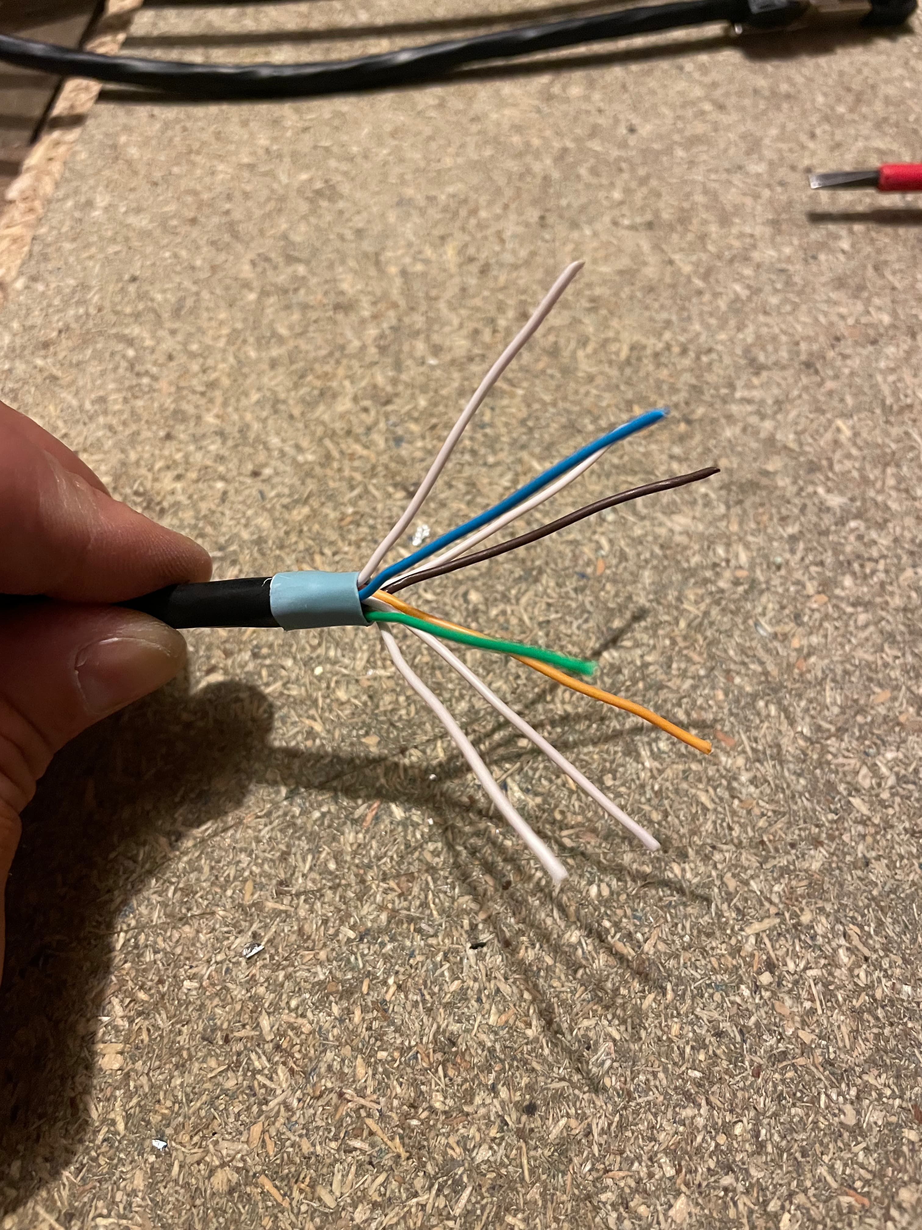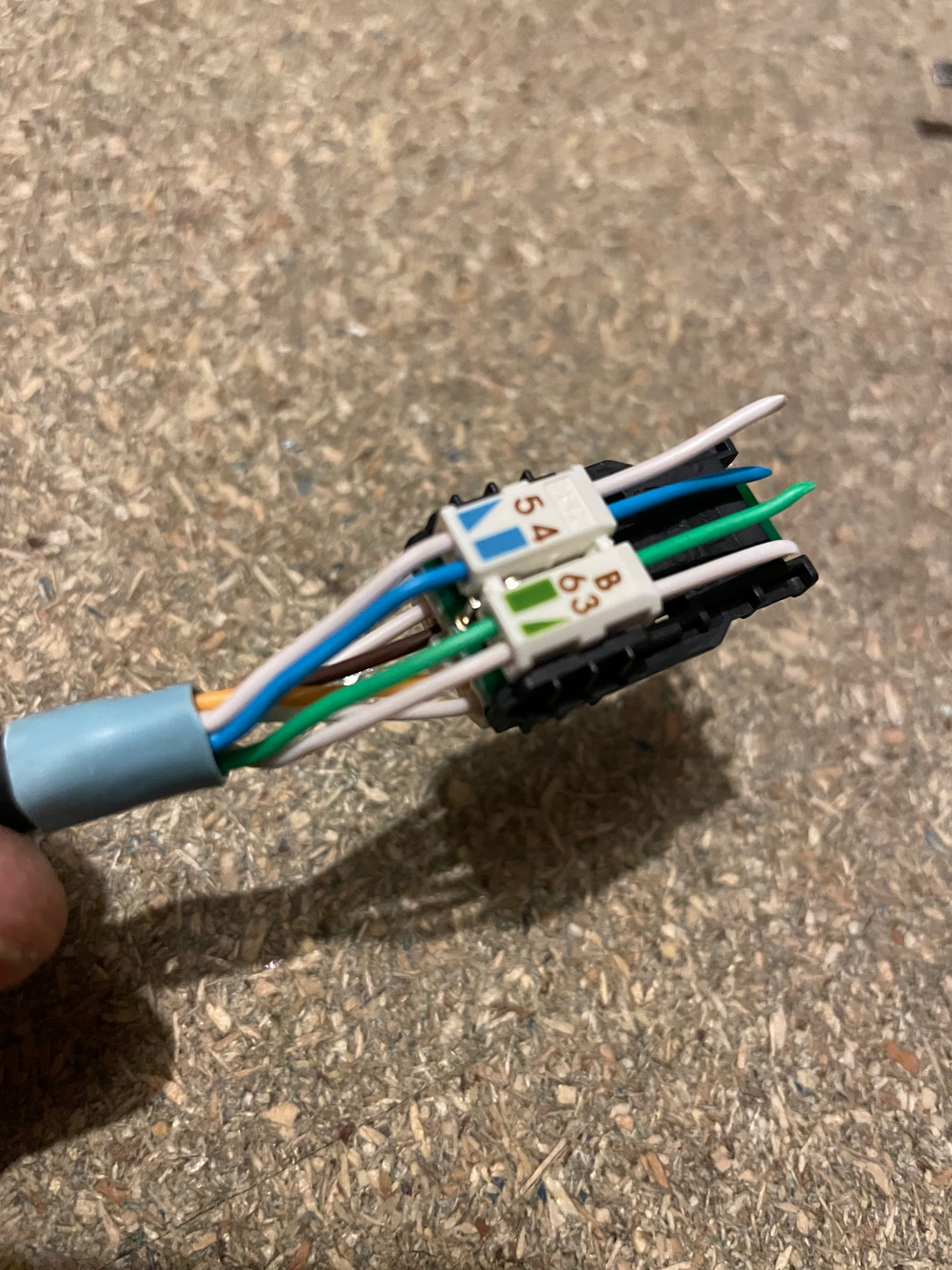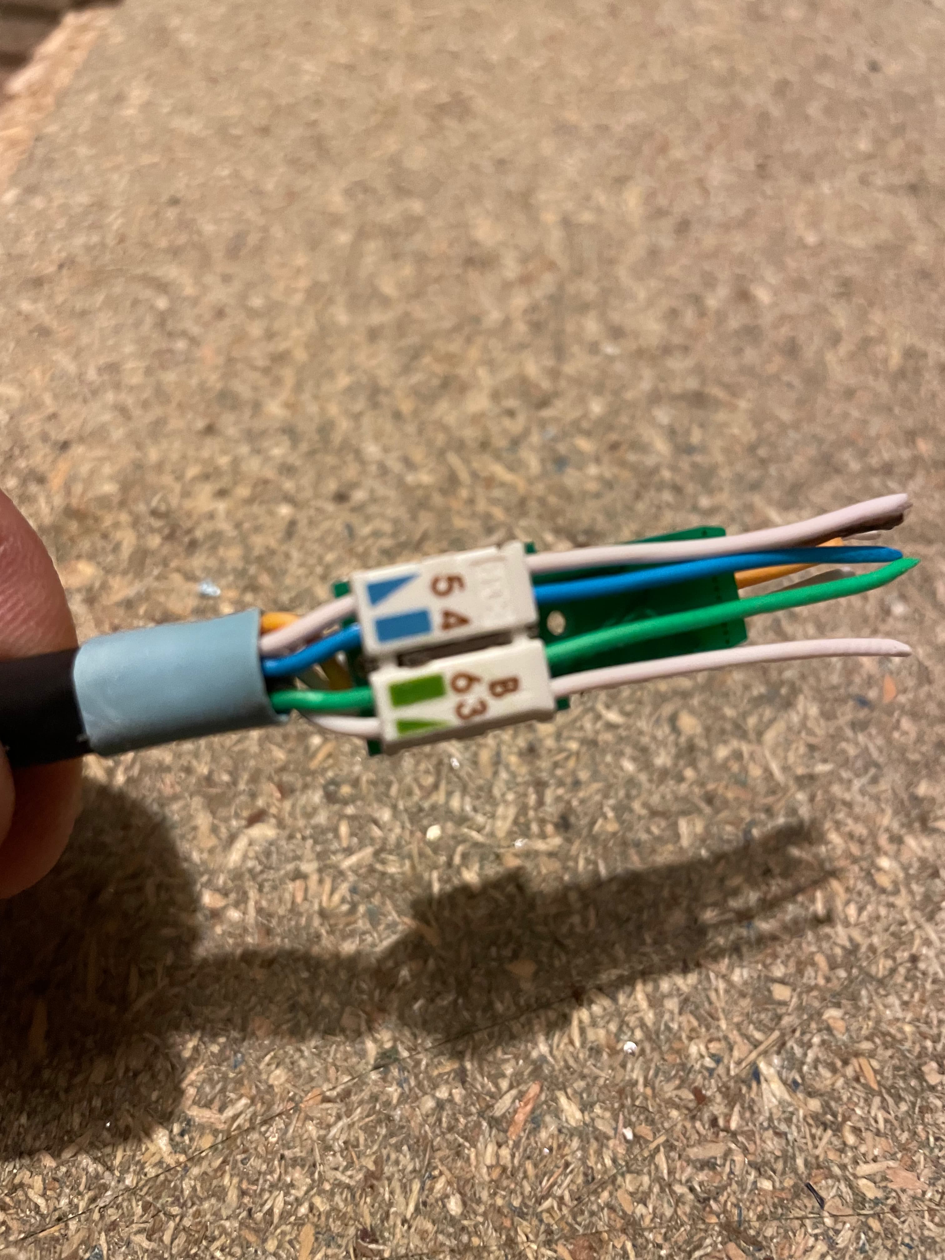 Pull the cables through taking care not to kink them. The most common error here is getting the colours wrong or simply missing the hole.