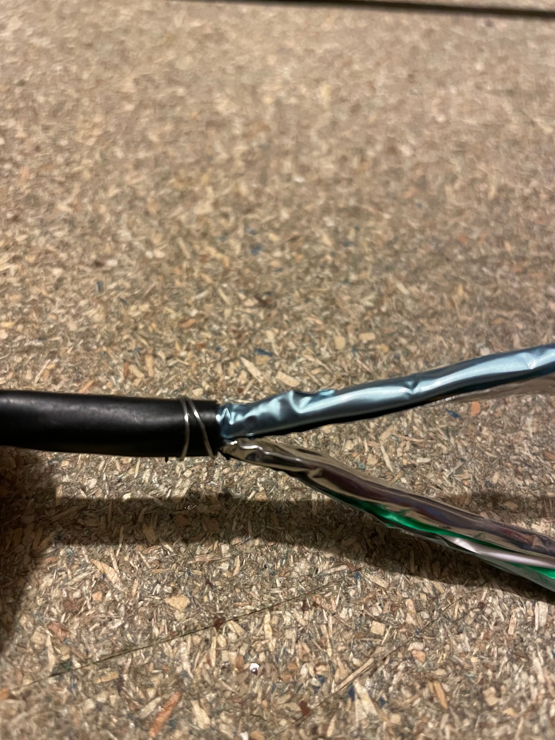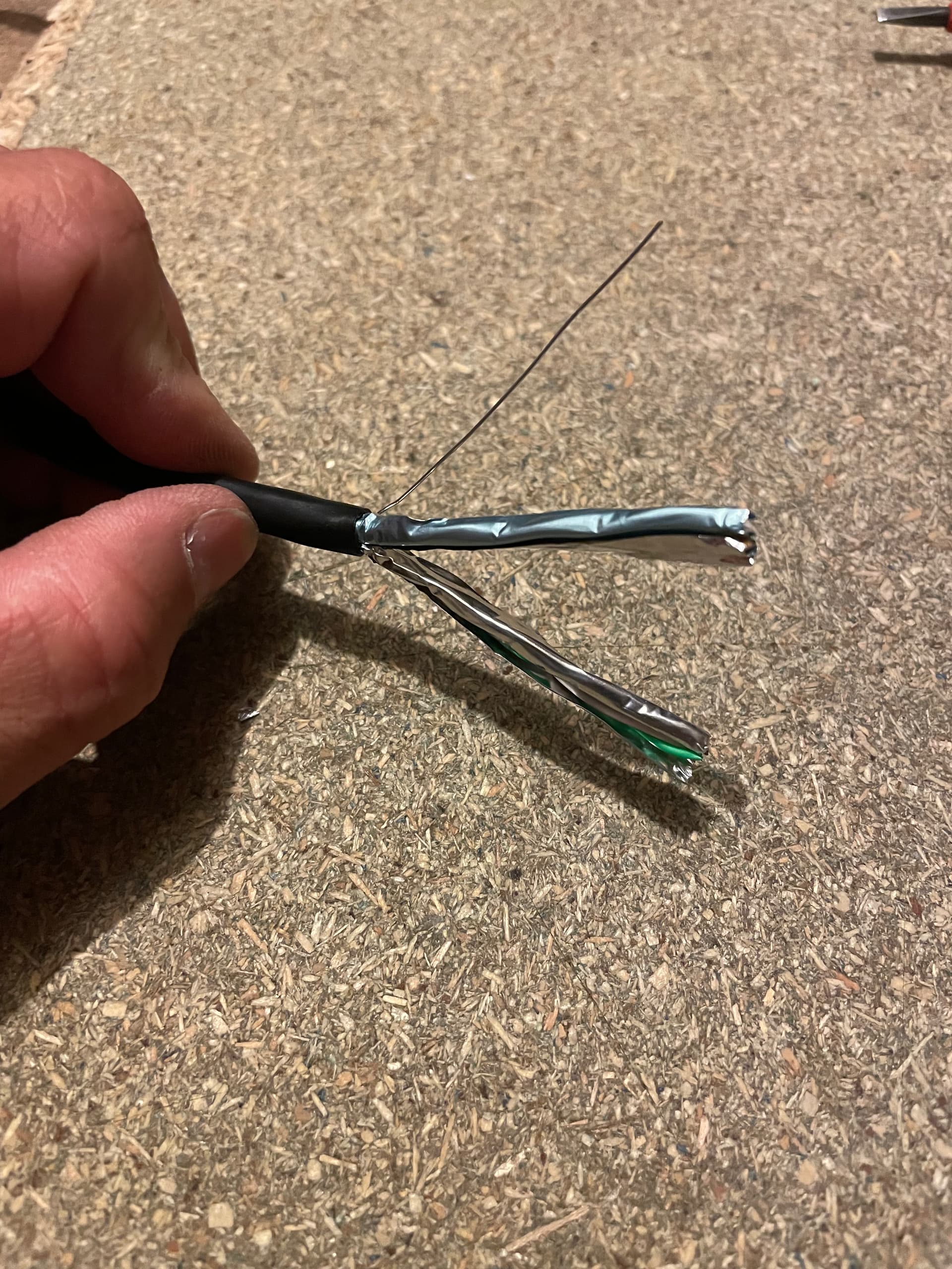 First, strip back the outer sheaf, I’ve used a Jokari stripper but a knife is fine. You don’t need to cut right through, just partial and it will split when bent. The second image shows the foil shield and the thin drain wire.
