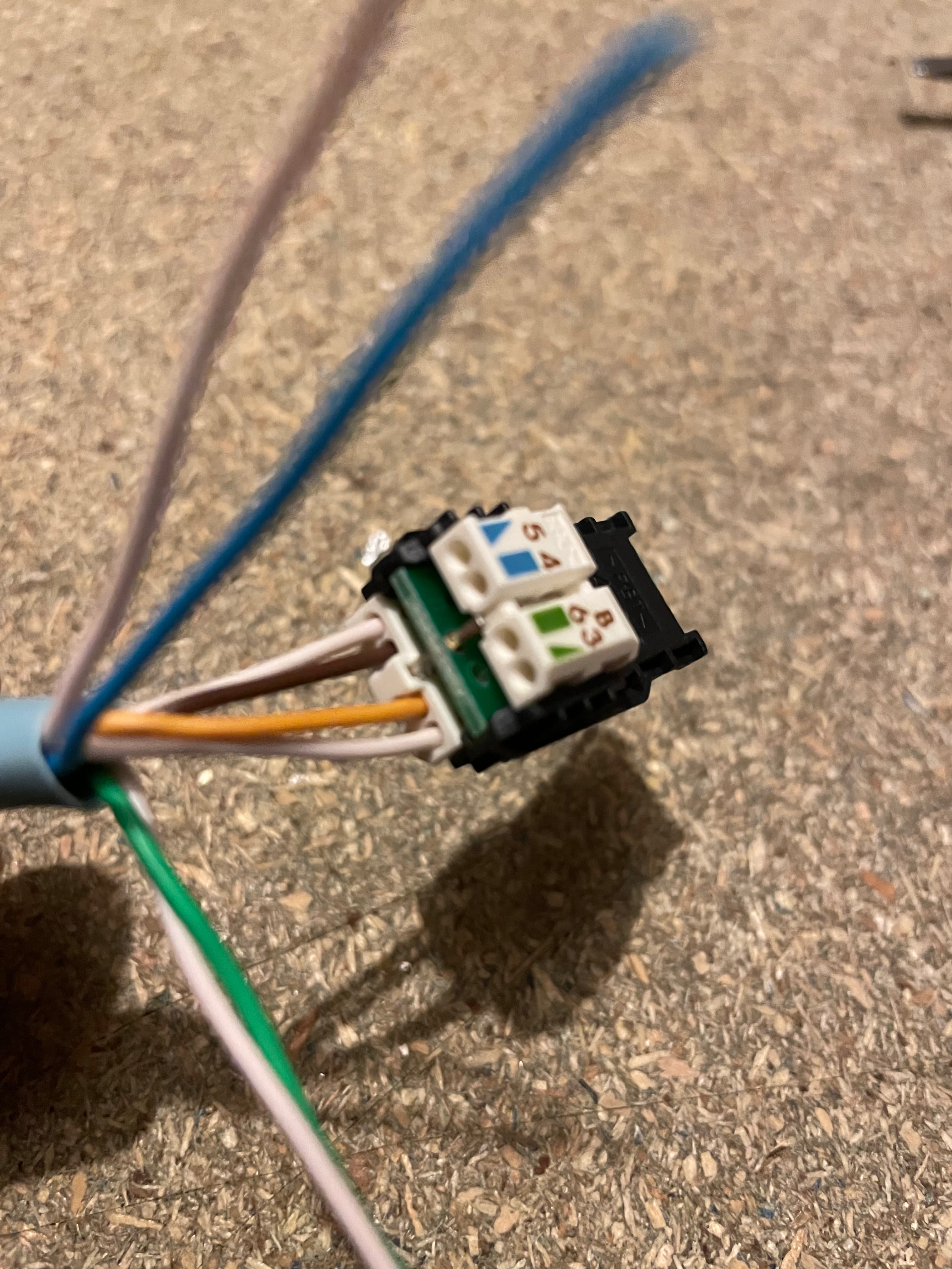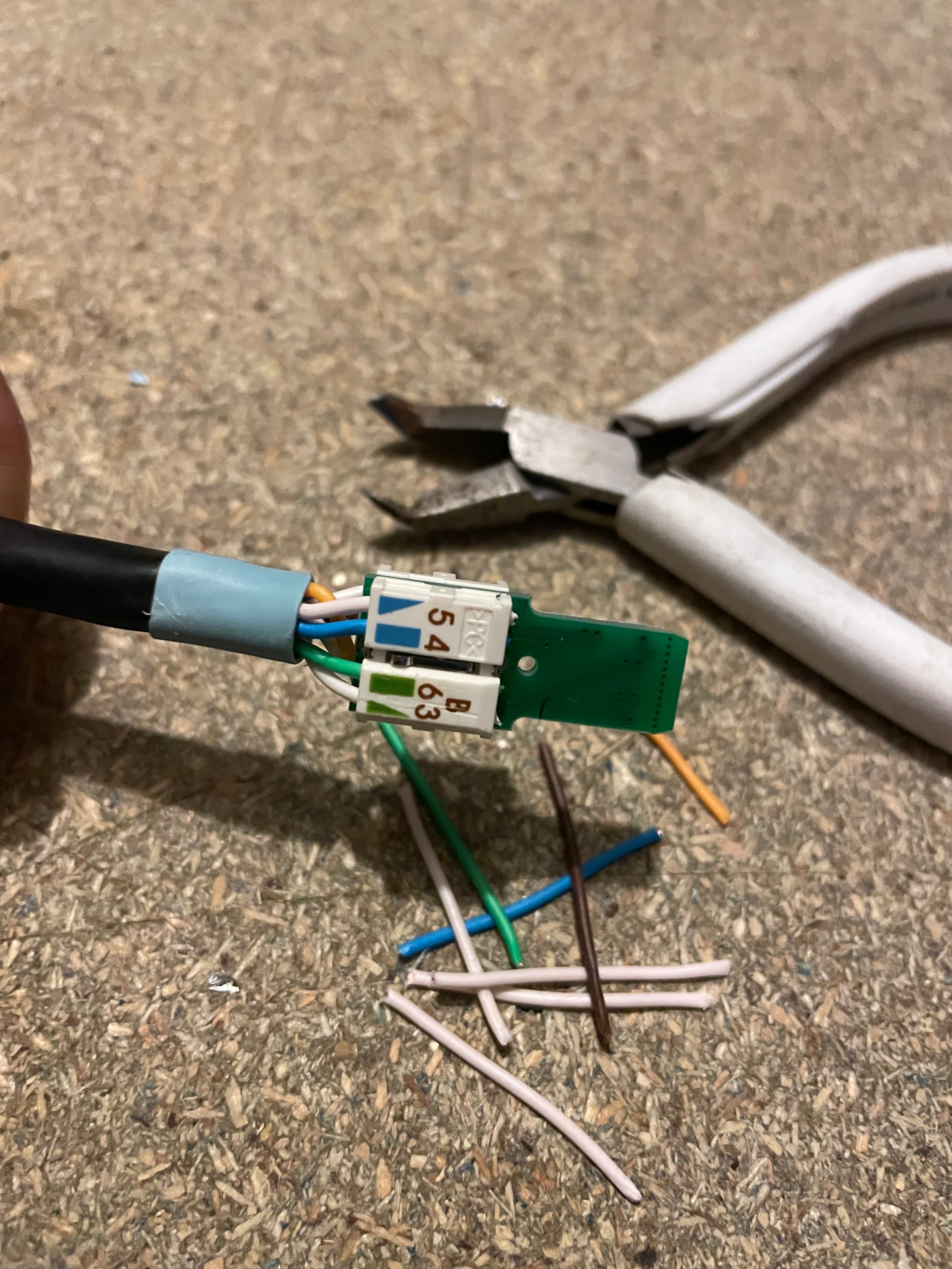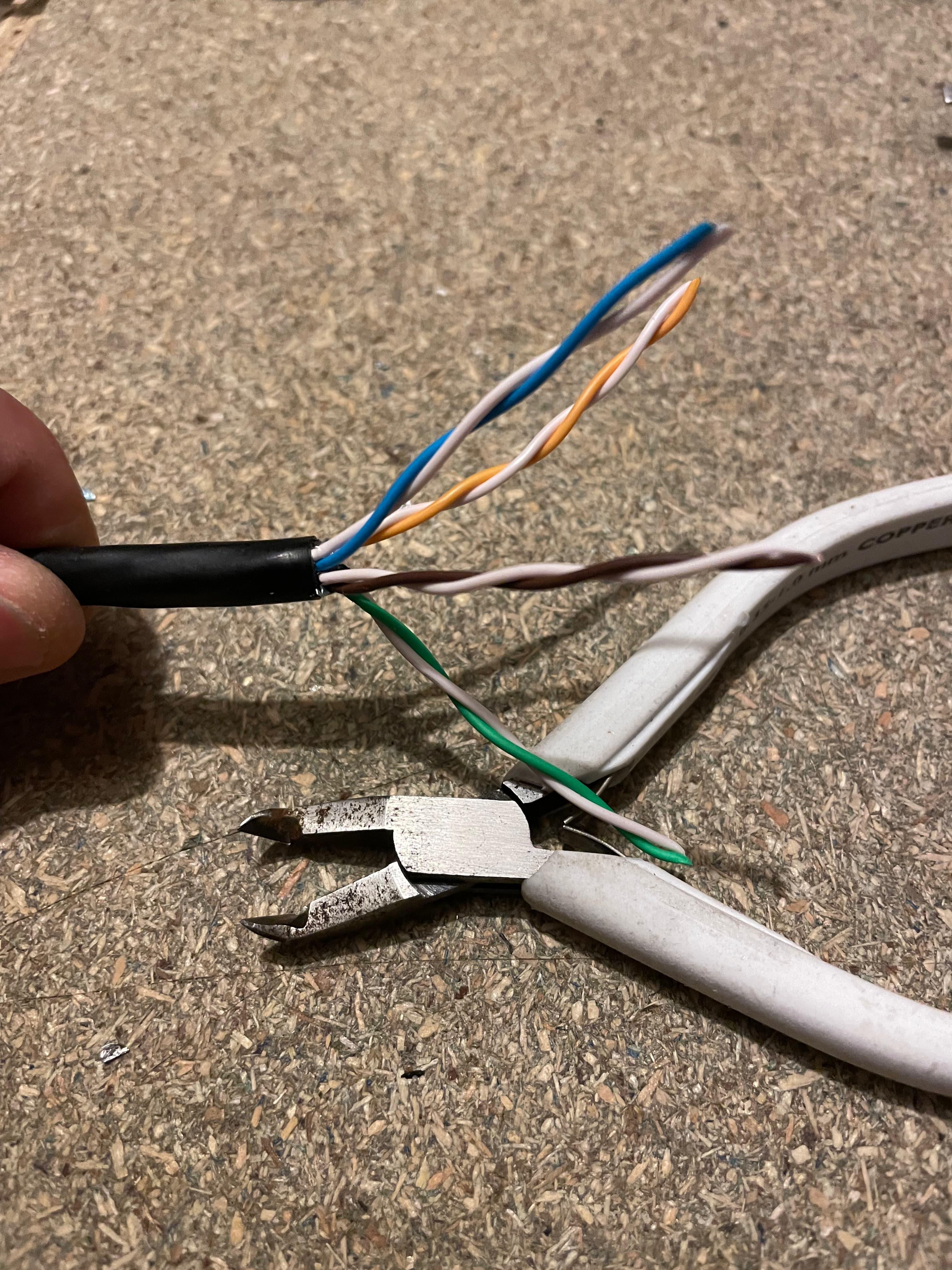 Drain wire cut off and foil shield removed. You always remove the foil, even if you keep the drain wire and earth the plug. I used some precision cutters to tidy as best as possible. There are 4 wire pairs, orange, green, blue and brown each with their corresponding white pair.
