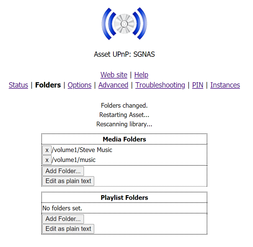 I managed to add my folder titled Steve Music by selecting the ‘Edit as plain text’ option from the folder tab in Asset then copying and pasting the path /volume1/Steve Music into the field then selecting add followed by apply. The folder then appears in the list (See image 1). However when I select rescan folders detecting changes, it doesn’t find any of the albums or tracks within the folder. The permissions are set to read as they were before I updated to DSM7.