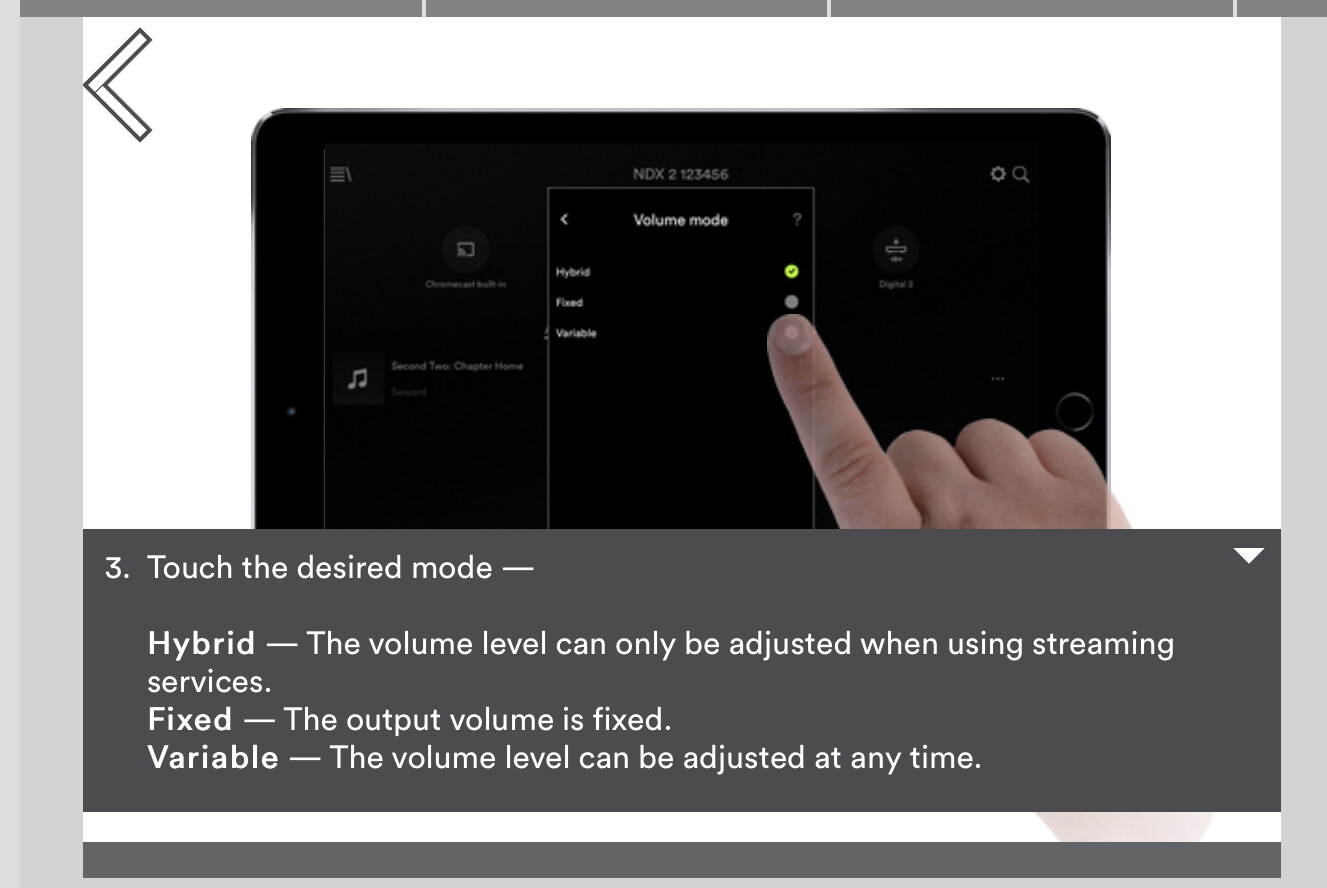 That screenshot looks pretty clear to me. In hybrid mode the digital volume works just with streaming services. Streaming services are Spotify, Tidal and Qobuz. In variable mode it works with anything going through the streamer, so local files, your nas, internet radio, the TV etc.