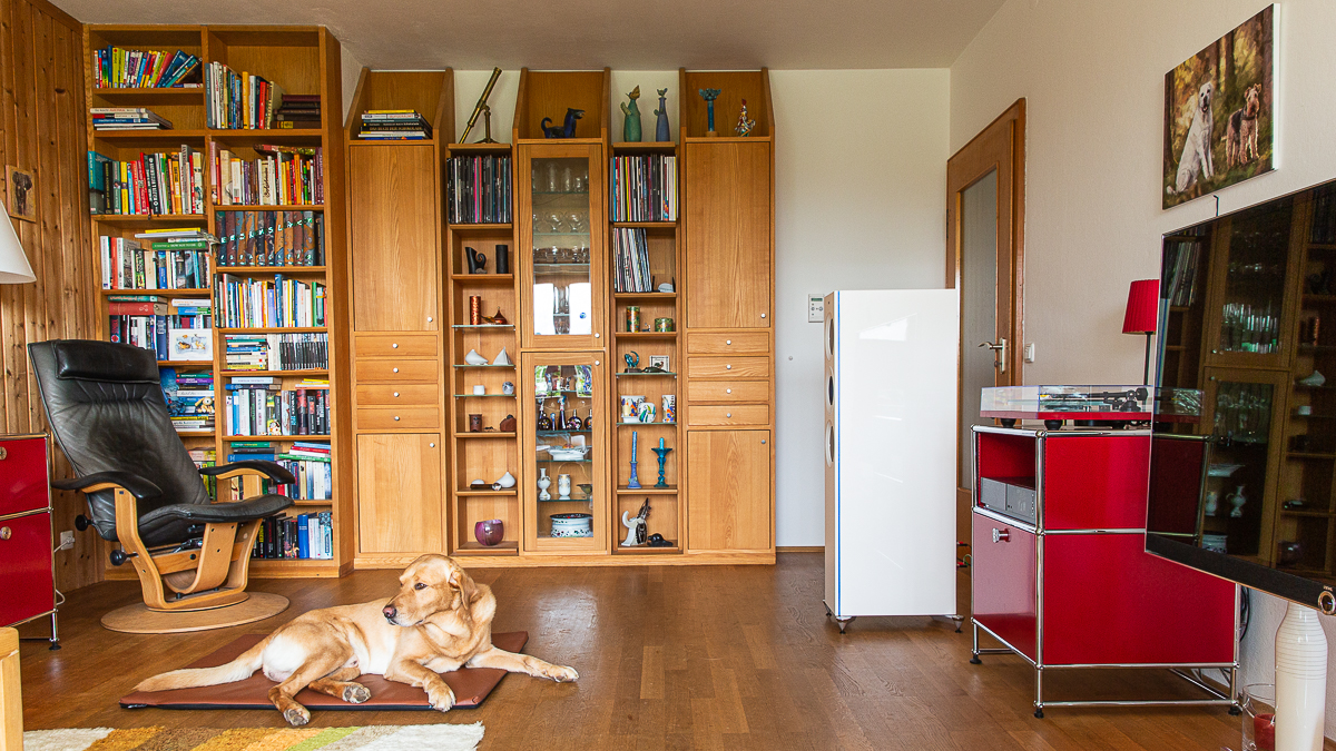 Love the Dog! Very handsome. Room is ok tooš do you move the chair between the speakers when you listen?