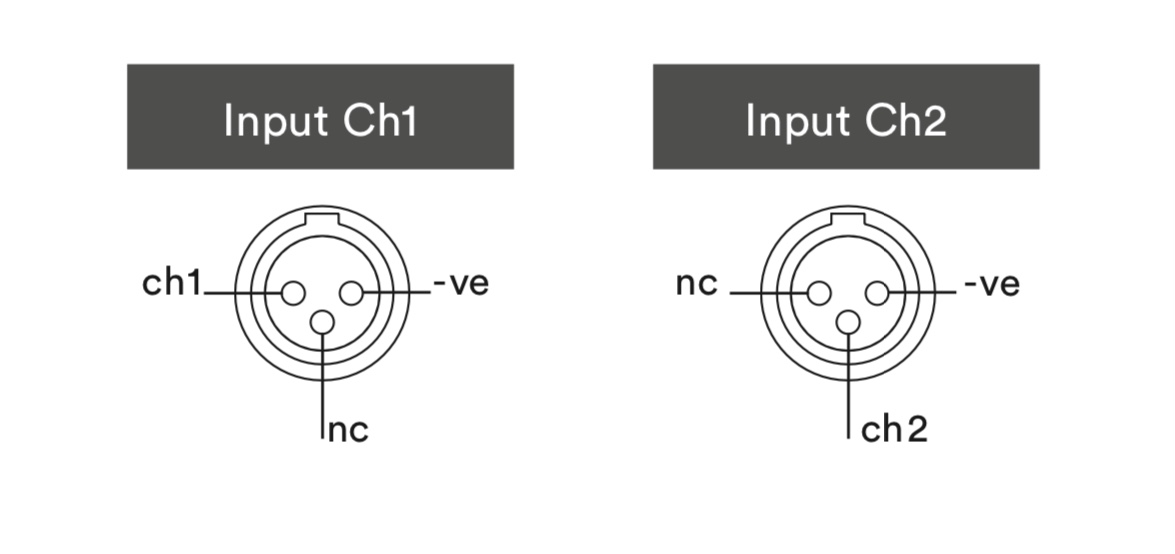 Wiring is very simple, but note that the Left (Ch1) and Right (Ch2) XLR sockets on the 500 (and 300) are wired slightly differently to each other. Your standard DIN4 to XLR cables have Green and Red bands on them which differentiate which cables are Left and Right respectively to ensure you use them with the correct socket at the amp end.