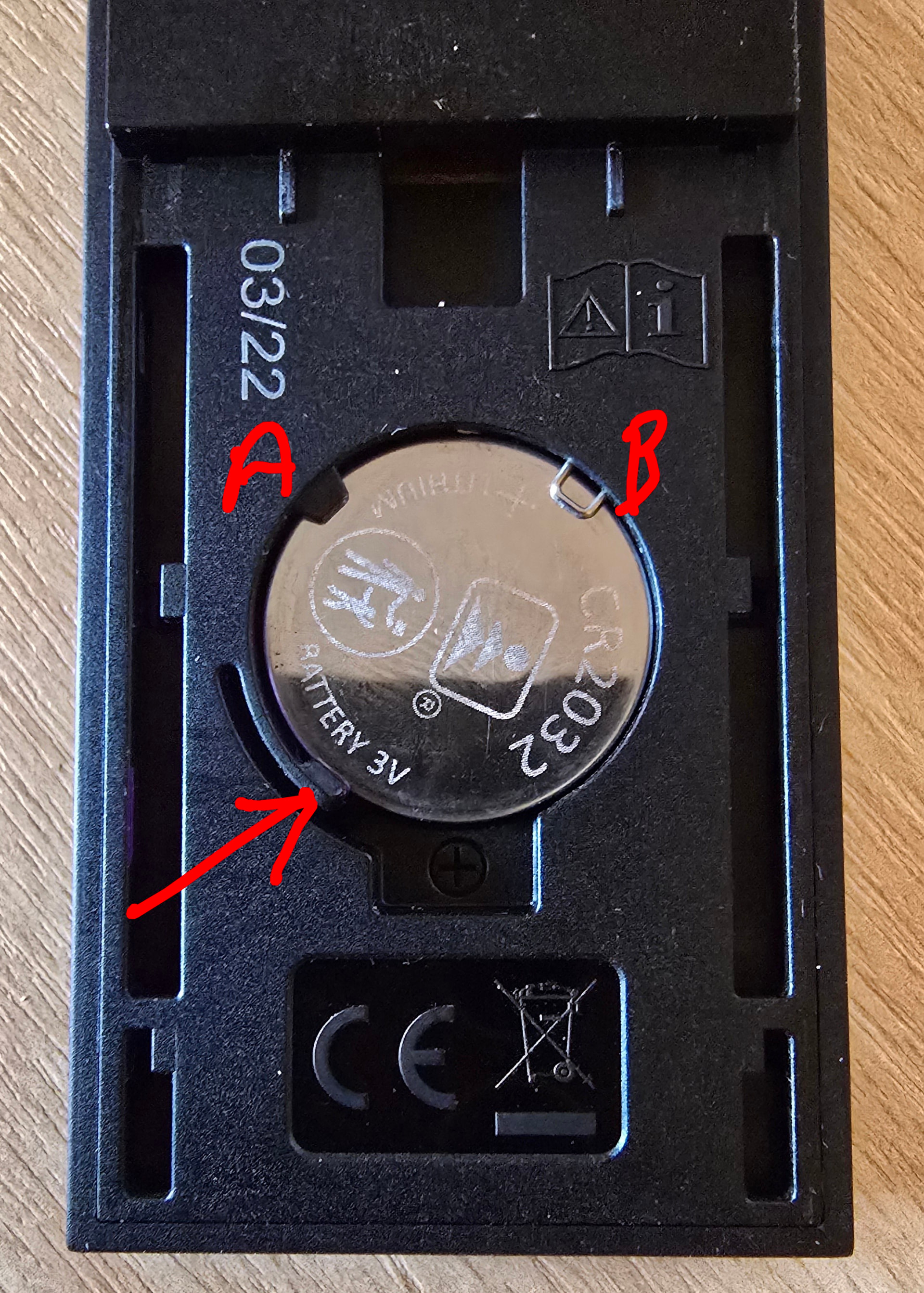 How on earth do you remove the battery from the QB2 remote? There is a small retaining clip where the arrow is and pulling that back let’s the battery pop up a little but the parts indicated by A and B hold it in place when trying to slide it out. I don’t want to force it in case I break it. Surely there must be an easy way to do this but I can’t see it!